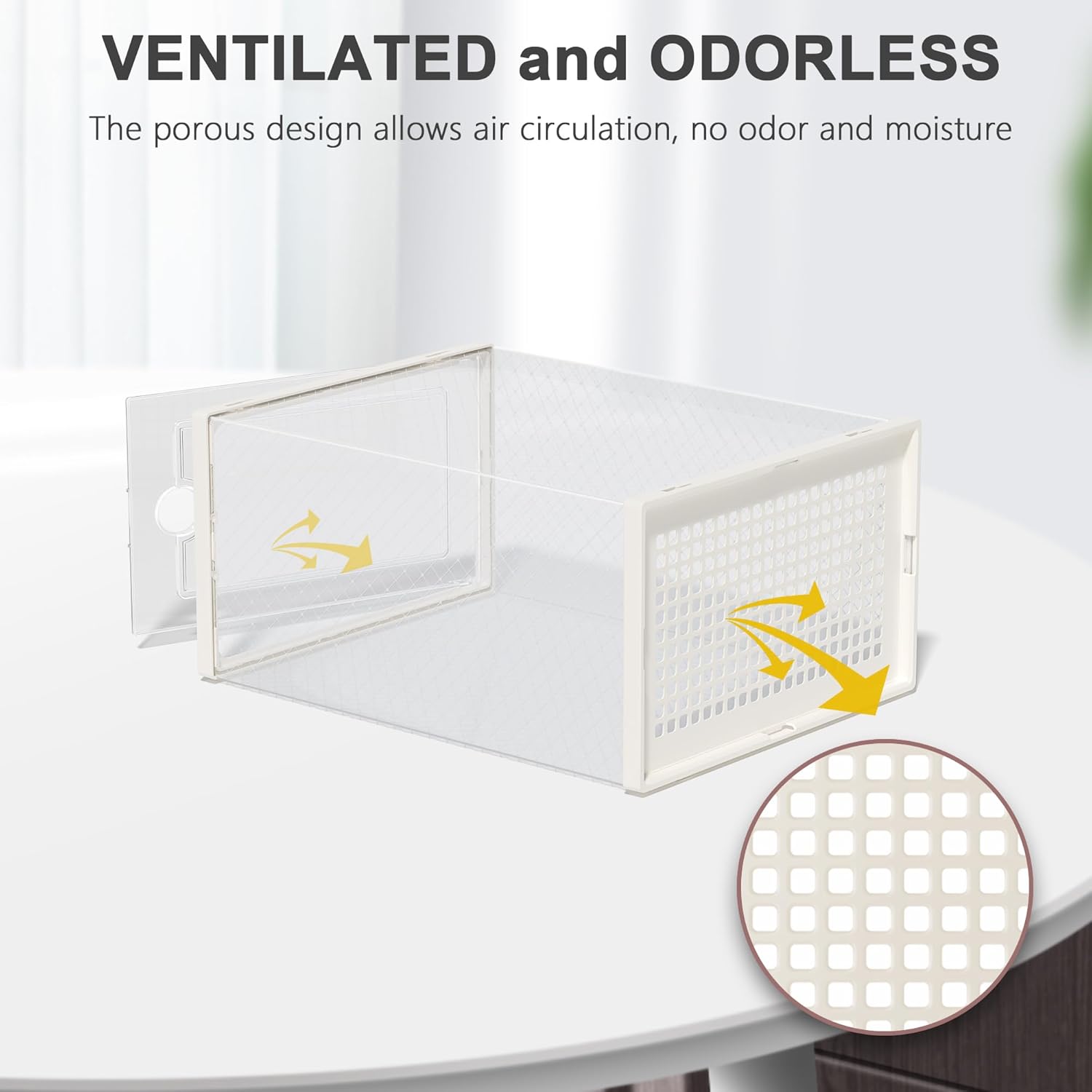• Sturdy and Ventilation Design: The two lids of the shoe organizer are made of ABS plastic material, which is very stable after assembly. The rear ventilation holes make air circulation and odor prevention