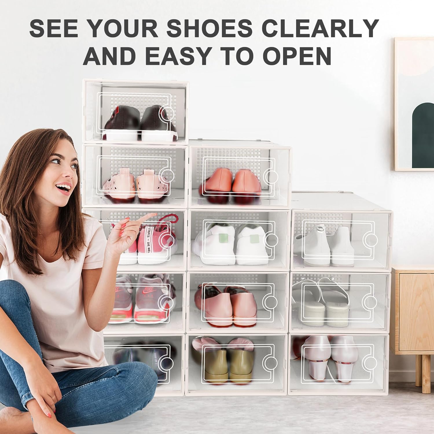 • Stackable Design: Slot lock design makes it easy to stack the shoe boxes together. You only need to Insert-and-push to finish the stacking. This design makes the shoe storage