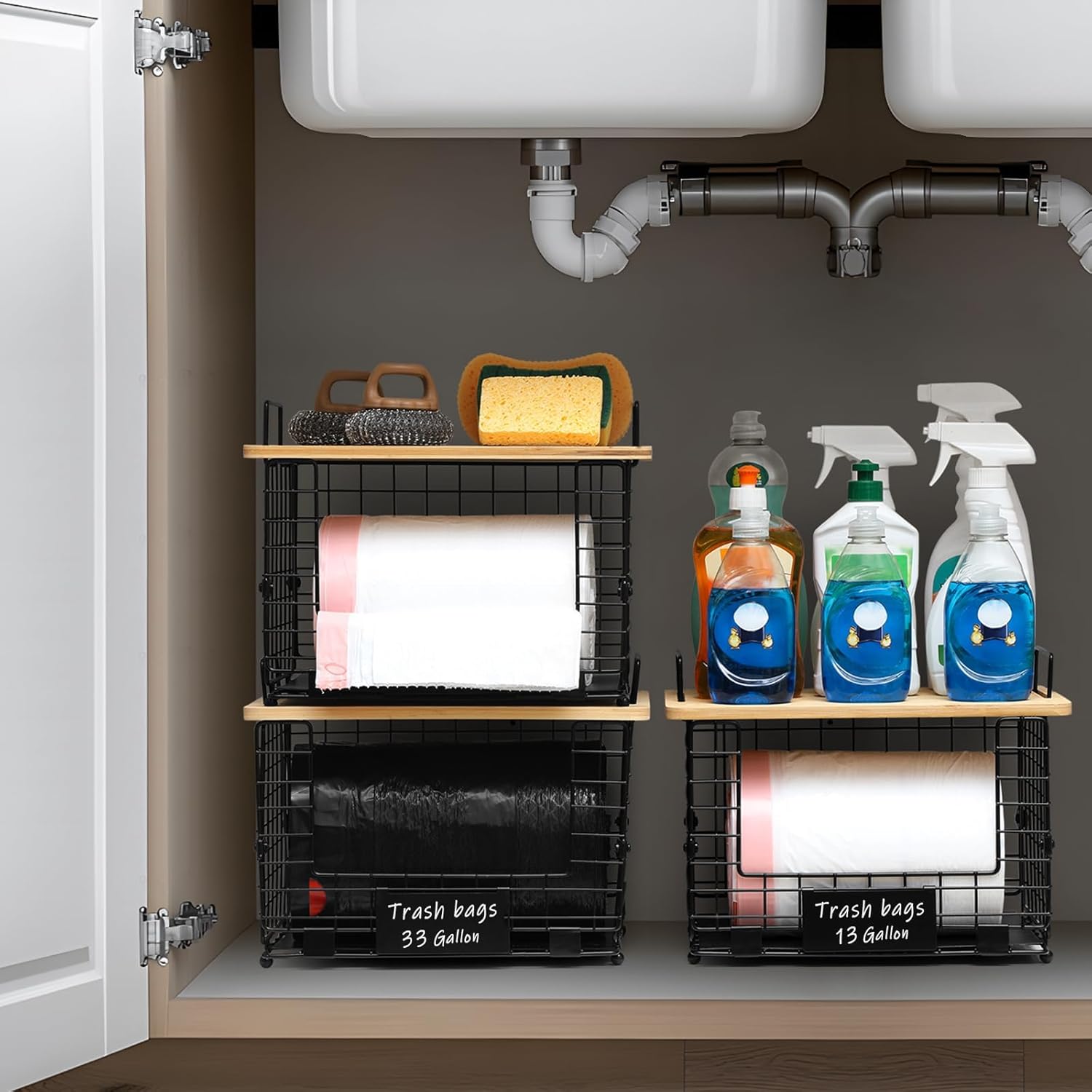 Upgrade Larger, Fit 13/30/33+ Gallon Trashbag Perfectly - 1 SET Stackable Trash Bag Holder with Tags & Bamboo Top, Garbage Bag Dispenser Stand, Kitchen Pantry Under Sink Laundry Room Organizer Basket