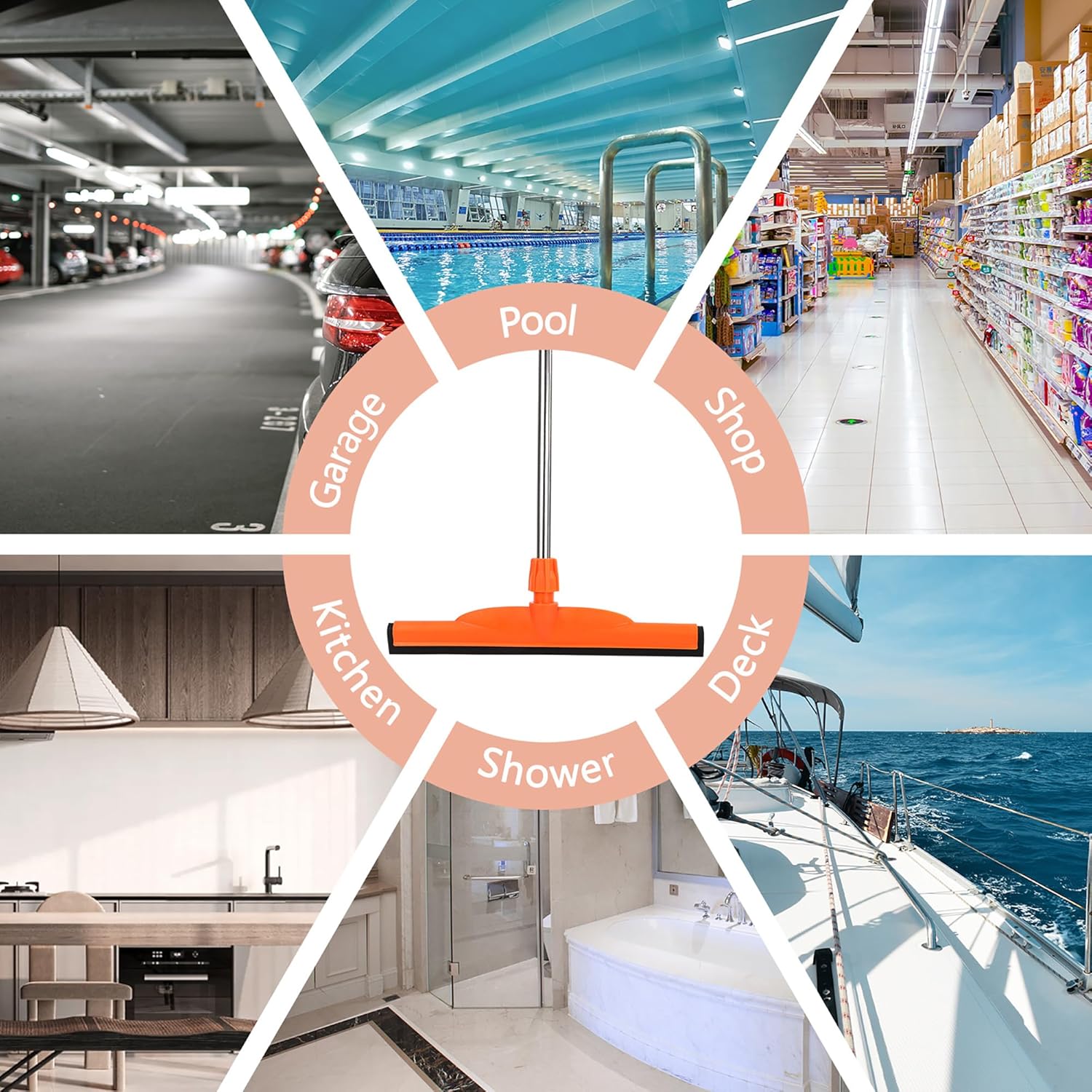 • Floor Squeegee Broom Multipurpose: Floor squeegee scrubber with 51’’ stainless steel pole - versatile cleaning for multiple surfaces, to dry floor surface efficiently and remove dirt and hair easily. Suitable for garage courtyard shower bathroom pet hair fur floor marble glass tile water foam cleaning. Whether you’re dealing with concrete floors, tile floors, shower areas, decks, or commercial spaces like garages, hospitals, hotels, and pools, this floor squeegee handles it all with ease