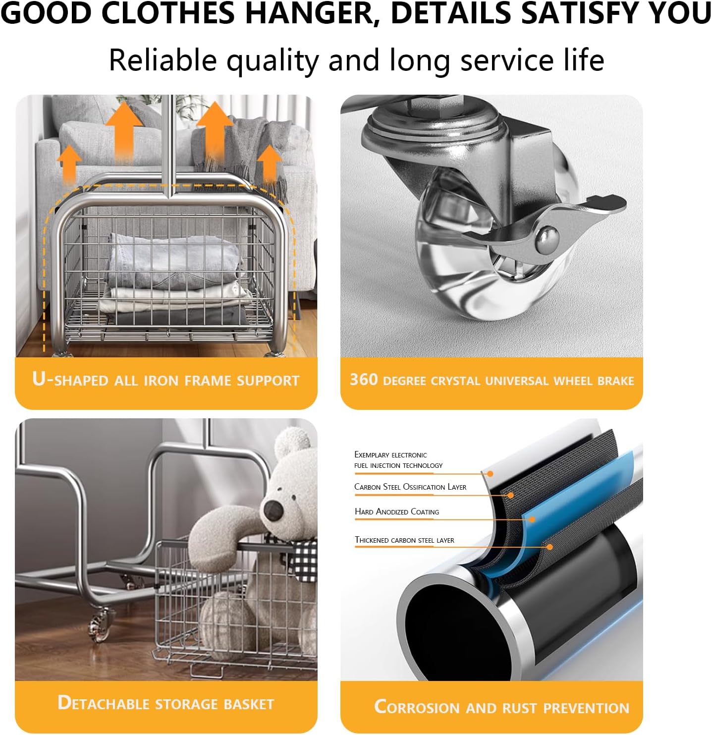 Garment Rack With Storage Baskets,Clothing Rack for Hanging Clothes, Multi-functional Bedroom Clothes Rack with Wheels for Bedroom, Living Room, Easy Assembly (40inch lenght)
