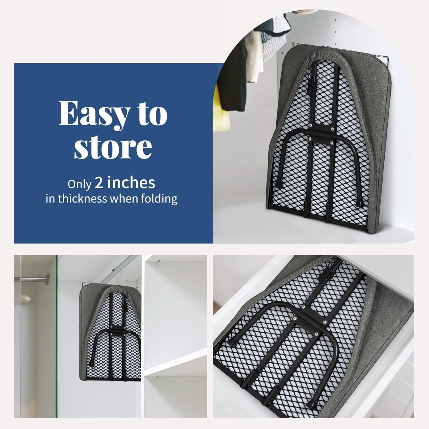 • Convenient Storage: This lightweight, foldable ironing board can be quickly folded in half for easy storage in cabinets, drawers, or hung in a closet, making it a practical solution for any space.