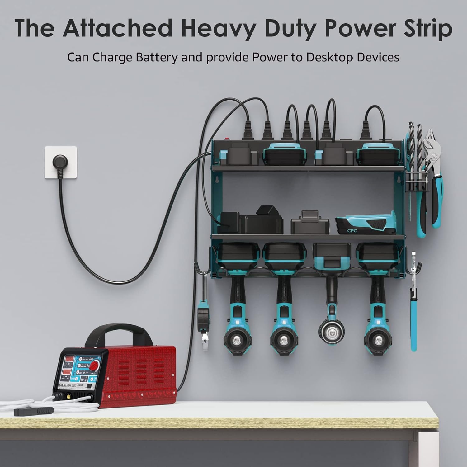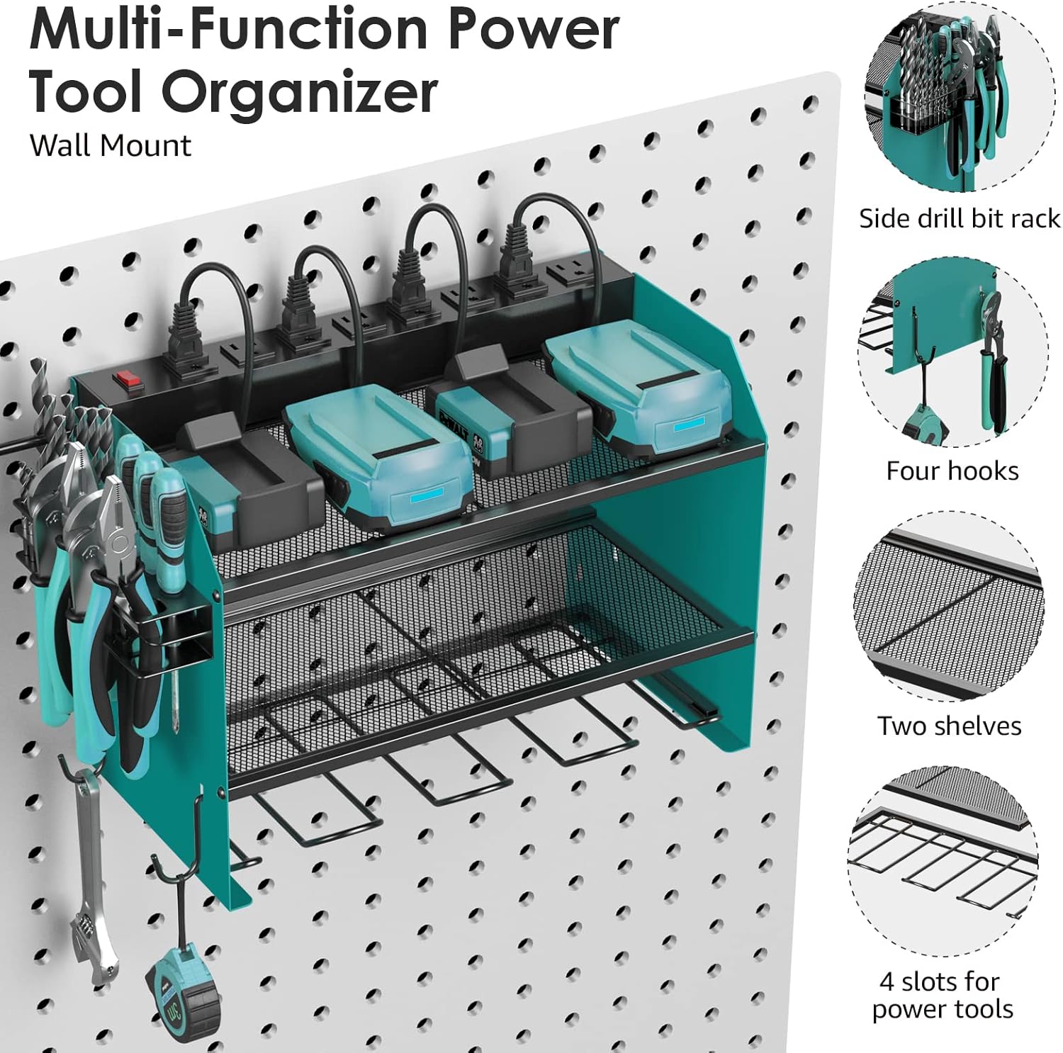 • Wall mount power tools organizer come with 4 slots, 4 hooks and drill bit rack, built-in power strip, double layer structure can keep rechargeable tools organized in the work area and save your bench space. The tools in the picture are for demonstration purposes only and are not included.