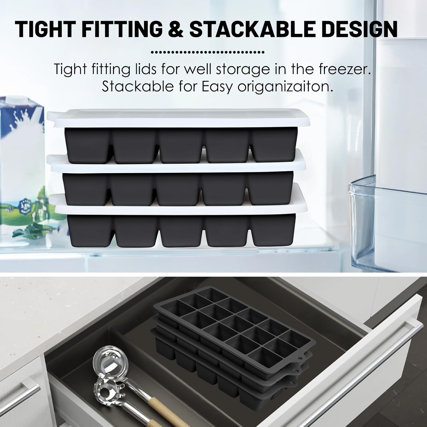 Silicone Ice Cube Trays 3Packs, Easy Release Ice Cube Molds with Lid, Freezer Stackable Ice Maker for Whiskey, Baby Food, BPA Free (Black)