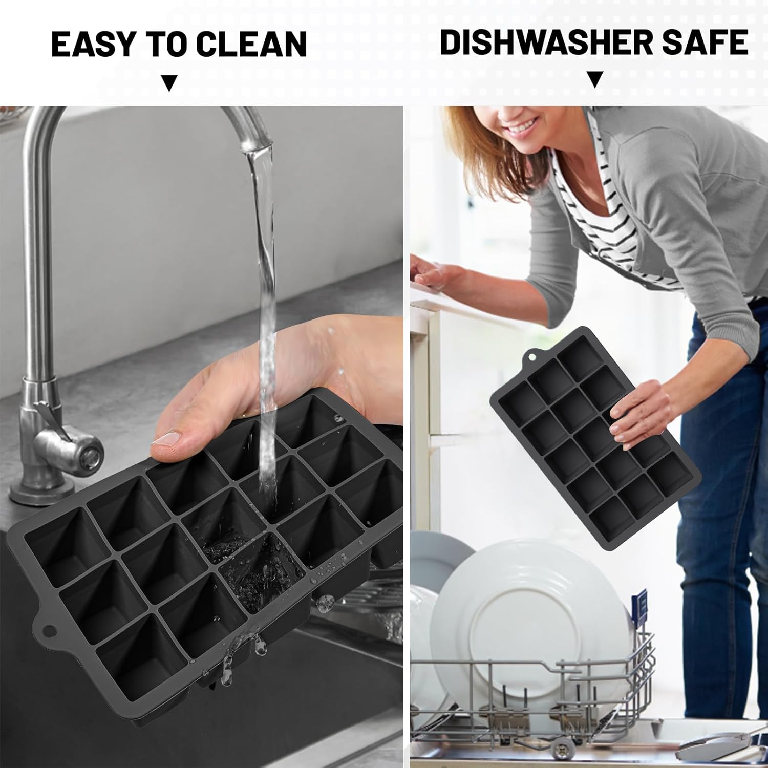 • Easy Release Ice Cube Tray; Soft silicone material and independent cavity design make it easy to release ice, you can push from the bottom to remove ice cubes for whiskey. Square ice cube trays has a non-sticky flexible surface, it is very easy to clean, dishwasher safe