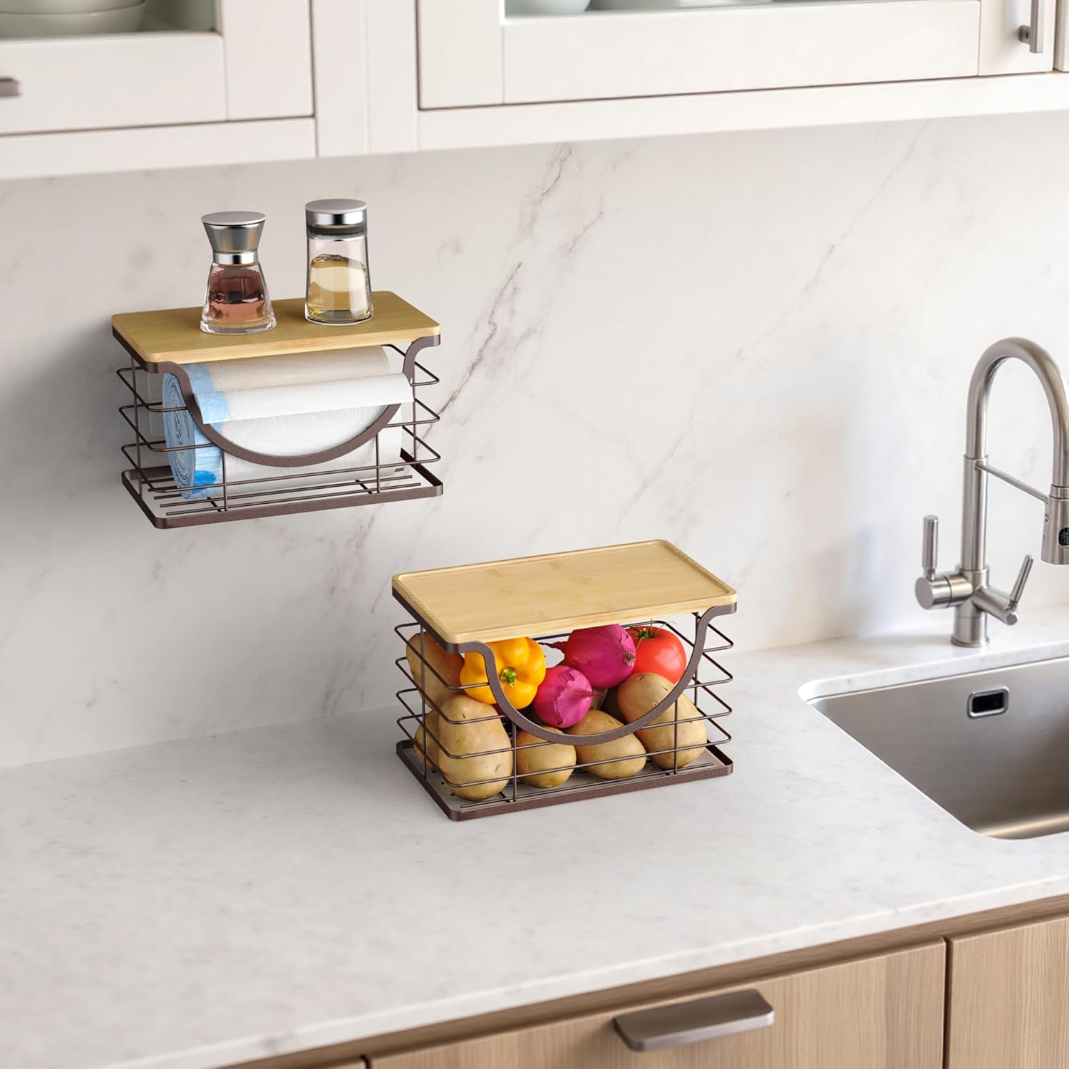 • 2 Ways to Use -stackable wire basket with bamboo top can be used on a tabletop or self-adhesive wall mounted. No need to drill holes, won't damage the wall. Multi-functional Garbage Bag Storage Dispenser is suitable for kitchen, laundry room, toilet, under the sink, cabinet, etc., you can store laundry supplies, cleaning supplies, vegetables and fruits, snacks and so on