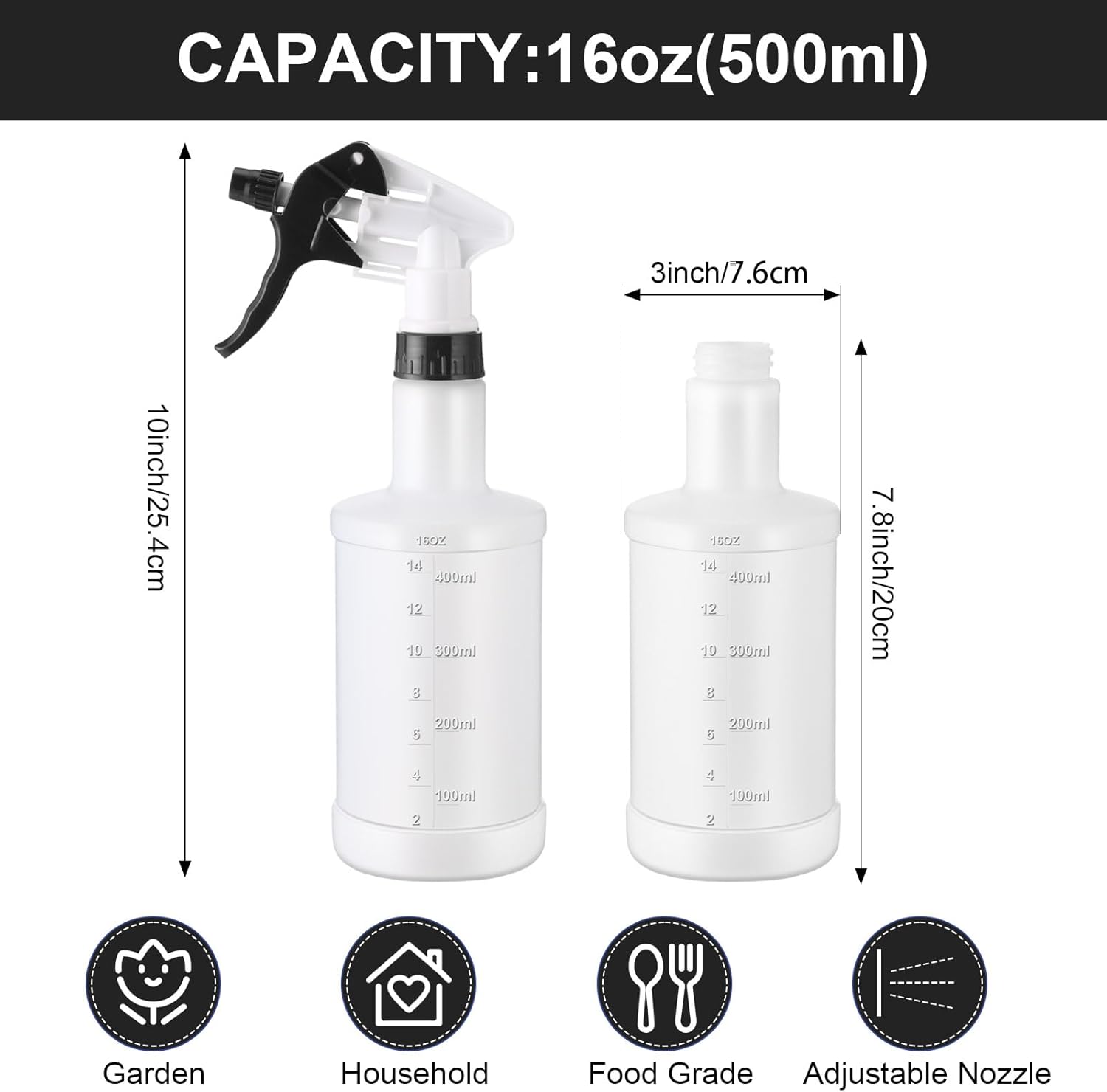 • Size and Capacity: the diameter of the empty spray bottles is approx. 6.7 cm/ 2.64 inches, the length is approx. 26 cm/ 10.24 inches, and the capacity is 500 ml/ 16 oz, suitable size to meet your various needs
