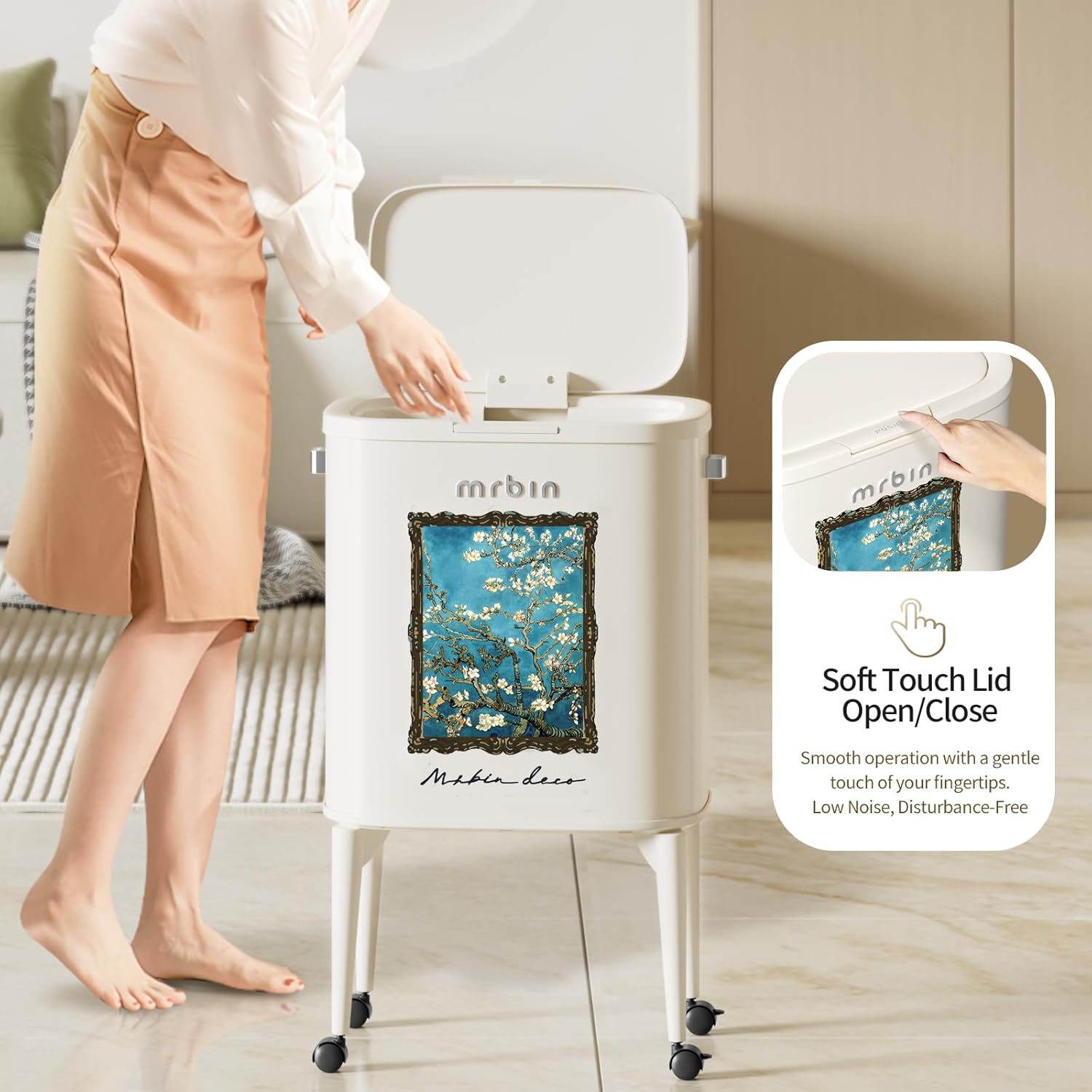 MRBIN Metal Kitchen Trash Can with Wheel Legs, 36L / 9.5gal Medium Press Lid Slim Removable Waste Basket, Pet Proof Tall Narrow Garbage Pail for Vanity, Bedroom, Bathroom, Living Room, Almond Blossom