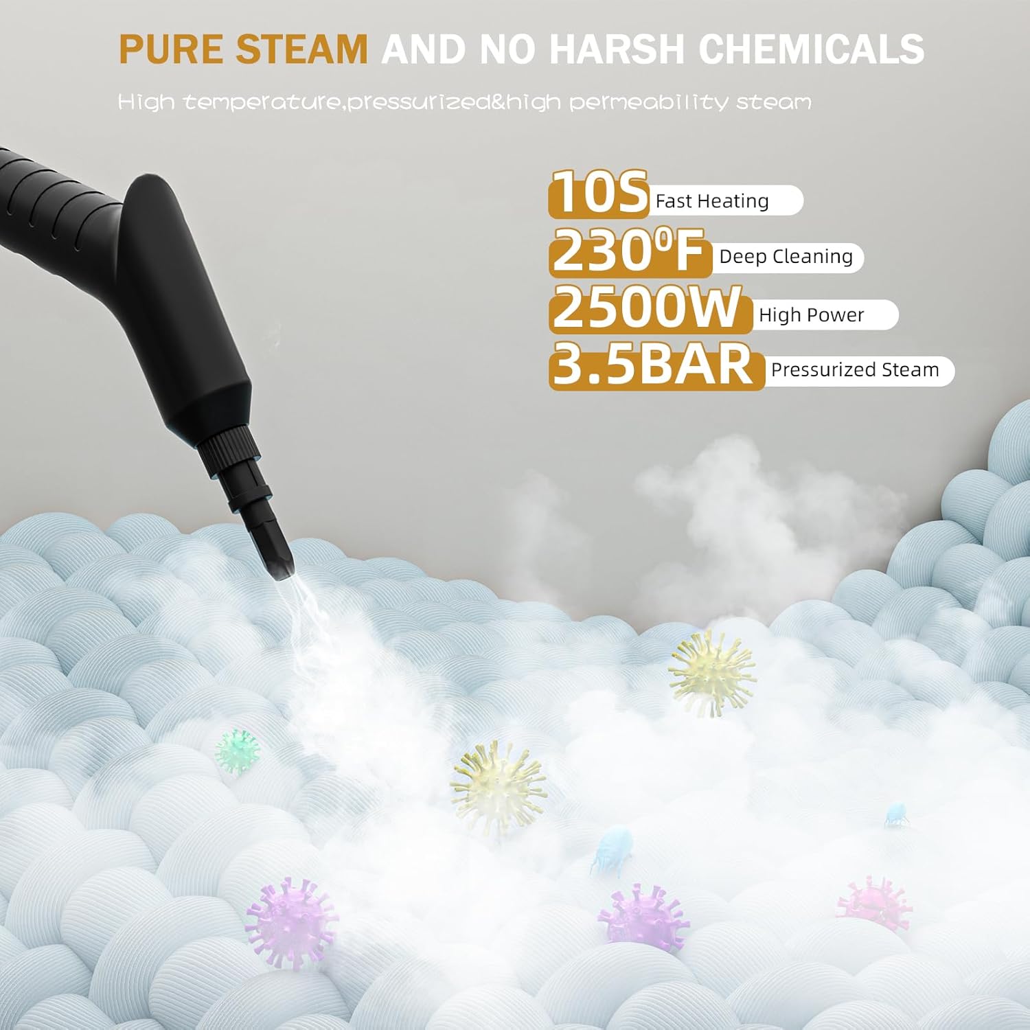 • Powerful High-Temperature Steam Cleaner: Instantly blast away stubborn grease,grime and stains with 2500W steam power reaching 221°F (105°C) in 10 seconds!Our handheld steam cleaner delivers 3.5 bar of high-pressure steam for deep cleaning of stoves,cookers,tiles,grout,sofas,upholstery,carpets and car.