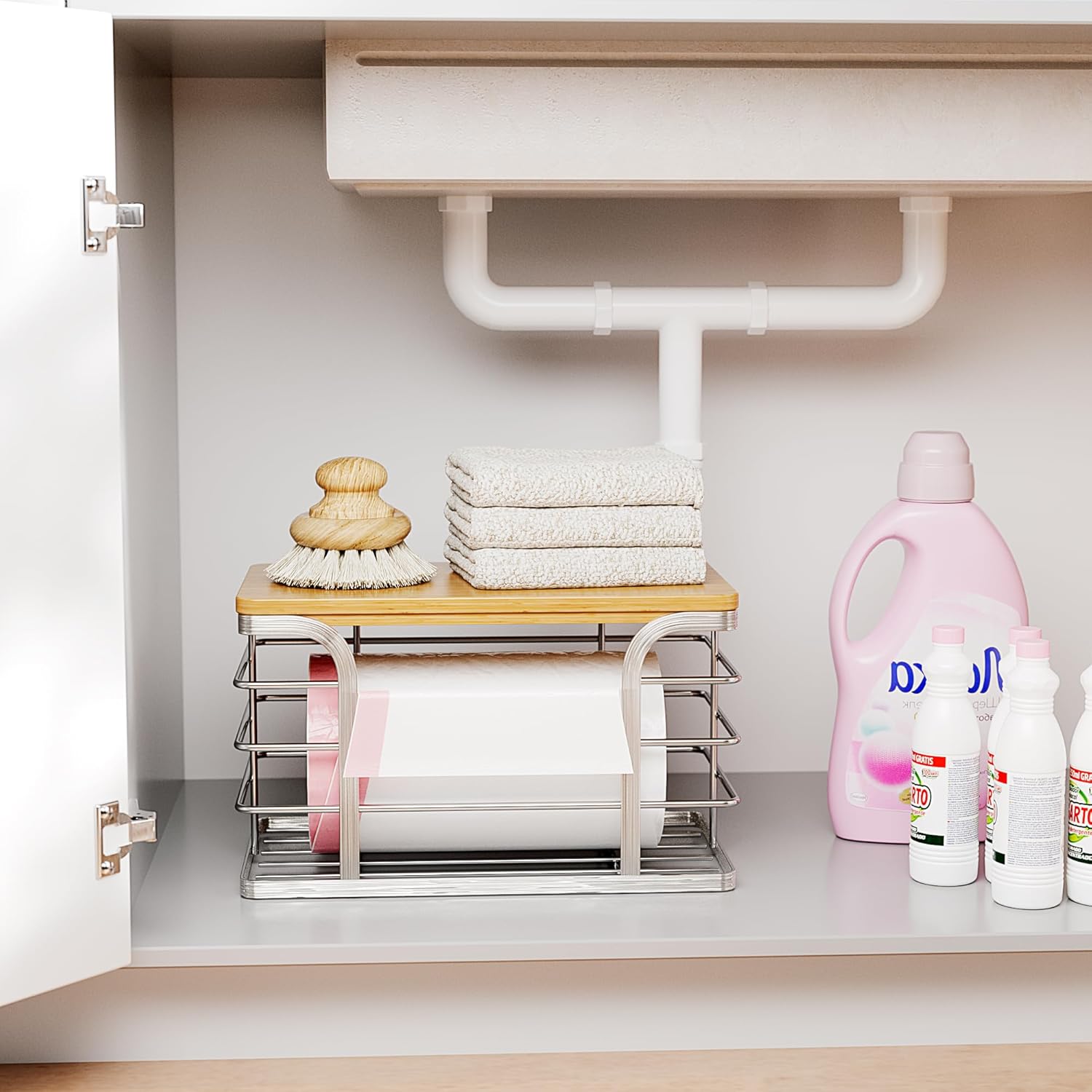 • Wide Applications:Standard size basket frame and bamboo top design make it perfect for multiple uses. Use it on kitchen countertops, on cabinet shelves and in the pantry to store fruits, vegetables, snacks, etc. Also suitable for under the sink in the kitchen and bathroom, laundry room organization and storage, etc