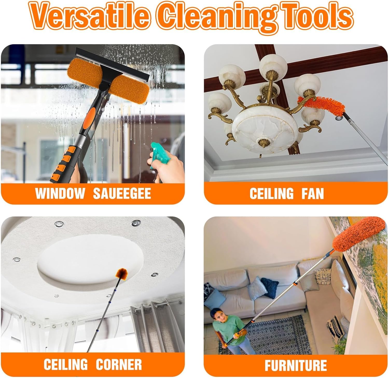 • Multiple Cleaning Heads, Cater to Various Cleaning Needs: Our extendable duster includes a flexible spider web brush with pole, a dusters for cleaning, a microfiber feather duster, and a ceiling fan cleaner duster. Each cleaning head is designed for specific tasks, ensuring thorough cleaning of all corners and hard-to-reach areas. This window cleaning kit will meet your different cleaning needs.