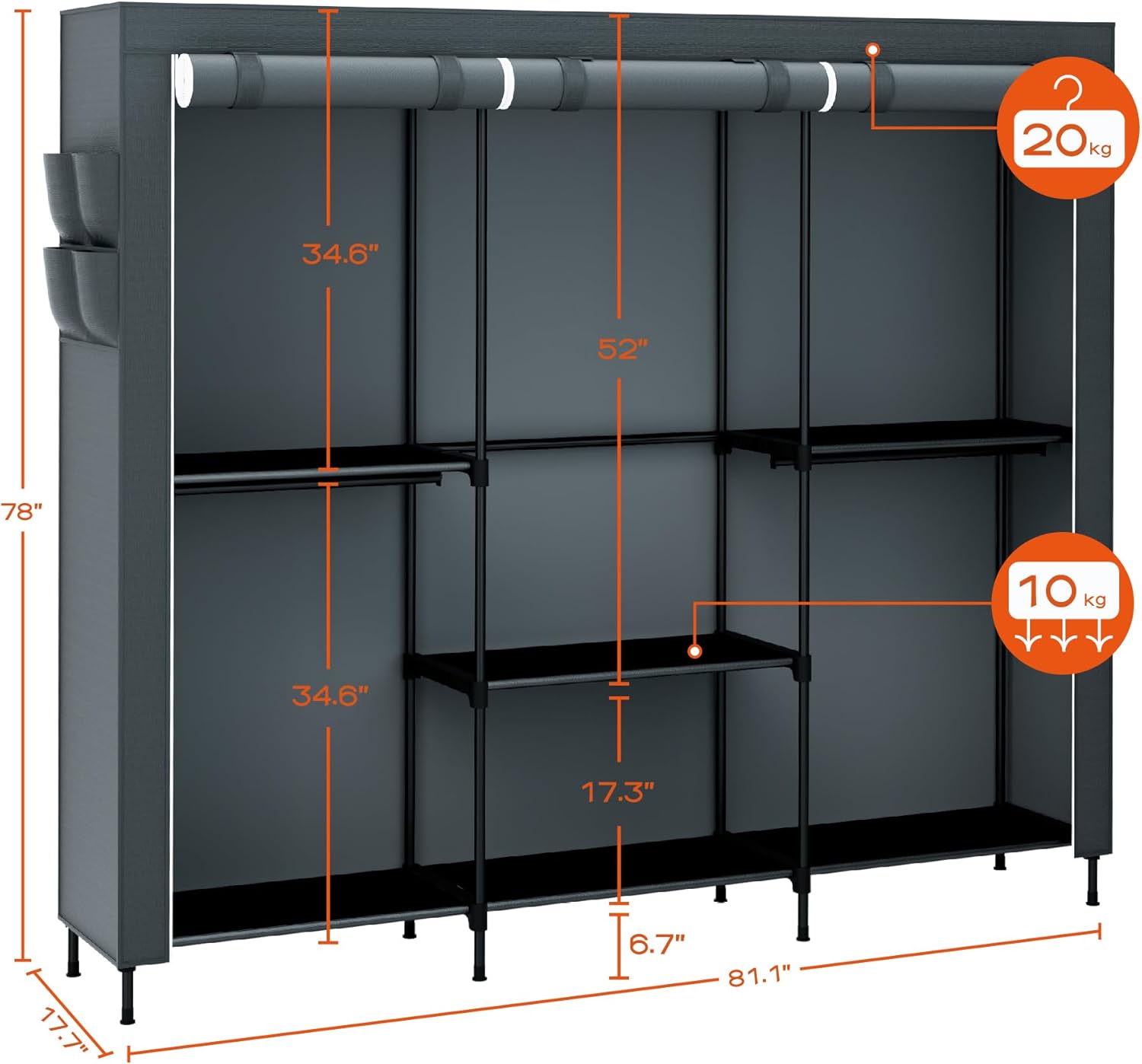 • [Stable and Strong] Featuring with steel tubing, high quality non-woven fabric and durable connectors, this wardrobe ensures long-lasting stability and support. Each hanging rod holds 44 lb and Each shelf holds up to 22 lb.