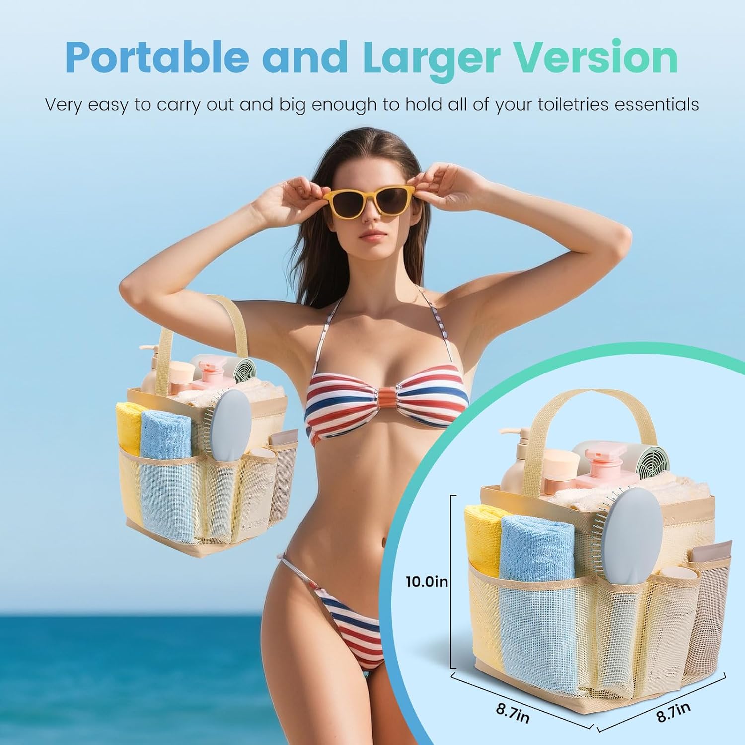 • Larger Capacity with 9 Pockets:The spacious mesh shower caddy gets 1 large center pocket and 8 side pockets to store all the essentials. A middle pocket fits larger items like shampoo, towels, and hair dryers, while side pockets fit smaller items like toothbrushes, facial cleansers, and razors.