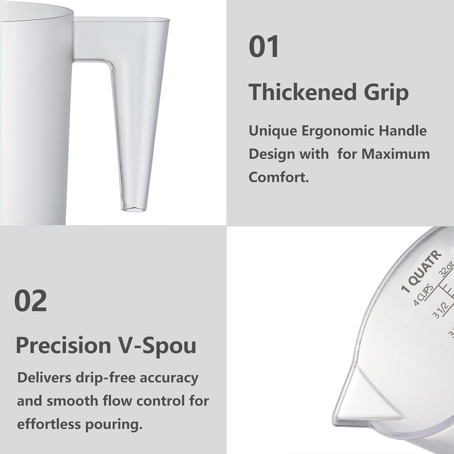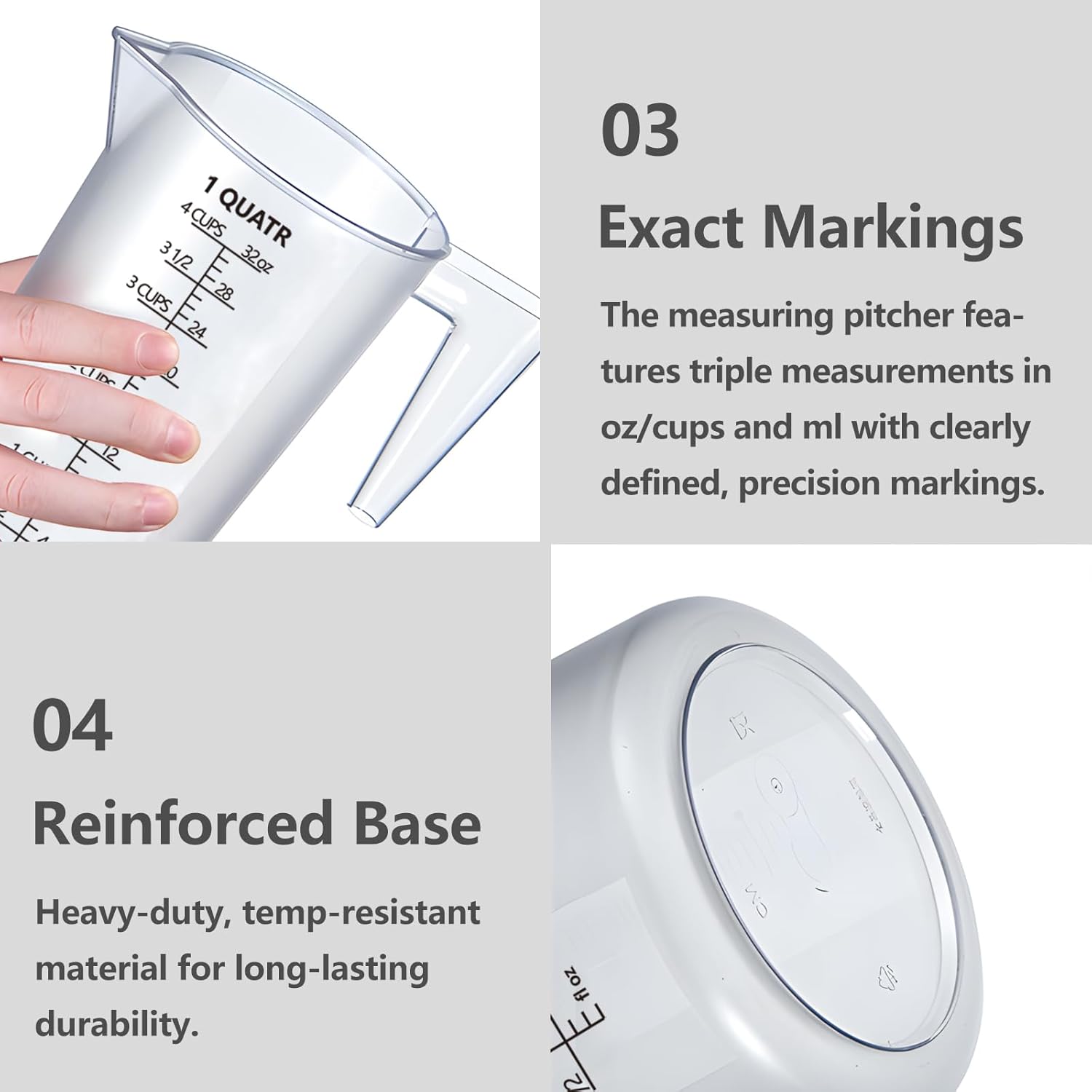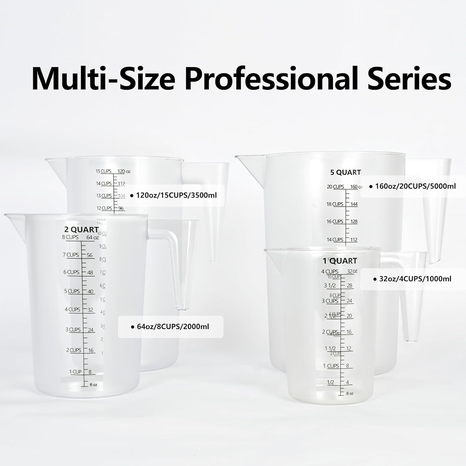 • Choose your ideal plastic measuring pitcher in 4 sizes: 32oz (1000ml/4cup) Measuring Pitcher: Compact for baking & small batches. 64oz (2000ml/8cup) Measuring Pitcher: Multi-purpose for kitchens & labs. 120oz (3500ml/15cup) Measuring Pitcher: Bulk handling for agriculture or catering. 160oz (5000ml/21cup)large measuring pitcher: Industrial-grade for pool maintenance, soap making.