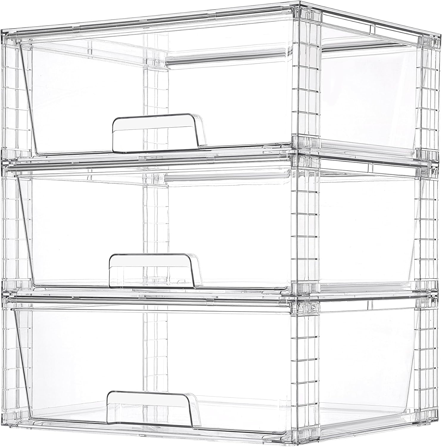 Vtopmart 3 Pack Large Stackable Storage Drawers,Easily Assemble Clear Acrylic Bathroom Closet Undersink Organizers,Plastic Storage Bins for Cabinet,Kitchen Pantry,Medicine Organization