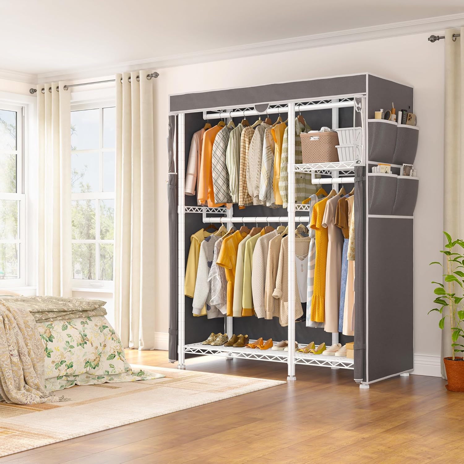 • Clothes Rack with Multifunctional Cover for Protection:The premium fabric of the rack is twice as thick as the others, ensuring that the clothing rack will last a long time. The all around coverage protects clothes from pets, sunlight and water.There are four pockets on each side of the covered garment rack, which provide additional storage space for stuff, like a hair dryer.