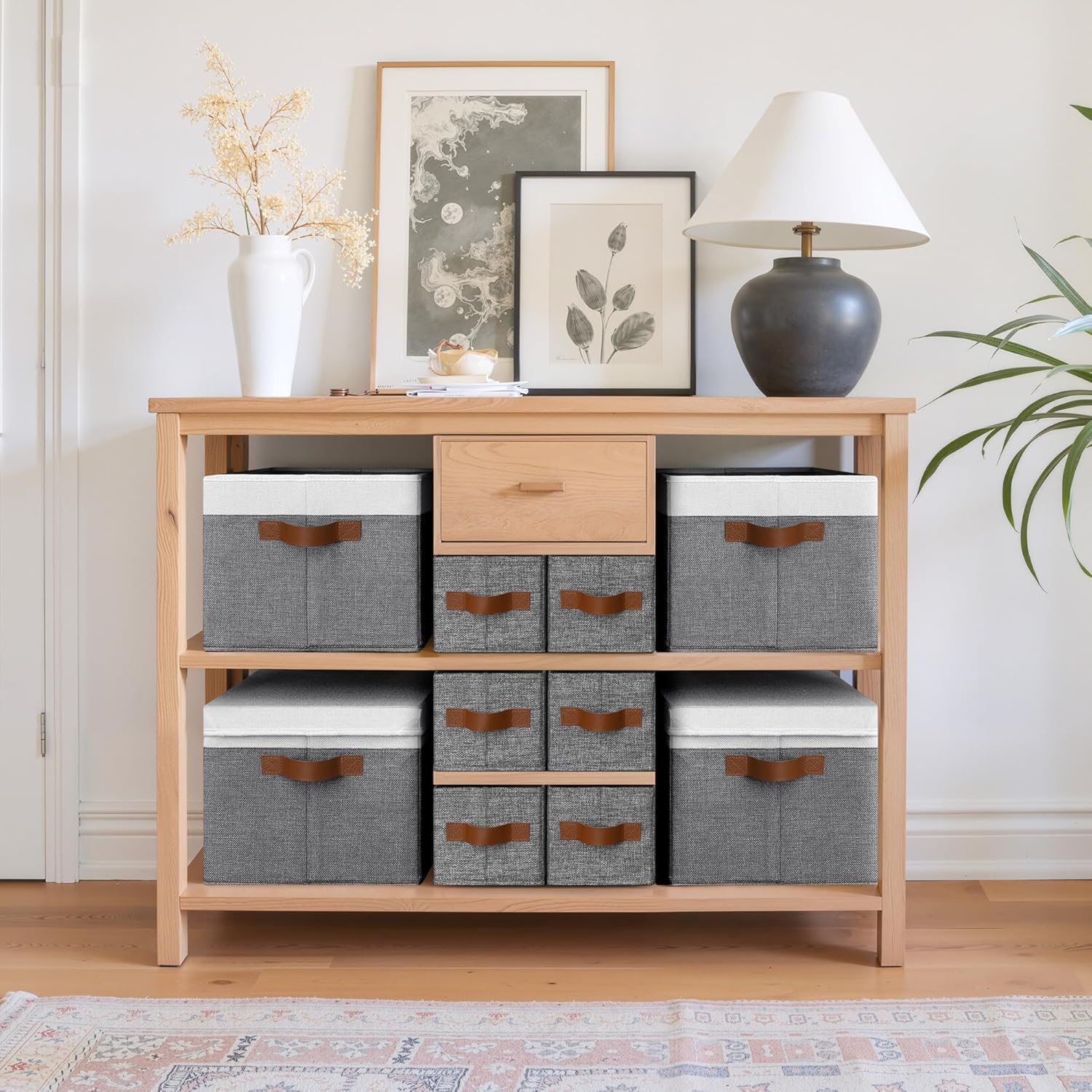 GRANNY SAYS Small Fabric Storage Bins with PU Handles, Storage Baskets for Shelves, Perfume Storage, Narrow Baskets for Organizing DVD, Photos, Aromatherapy, Scarf, Diaper, Cd, 3-Pack, Gray