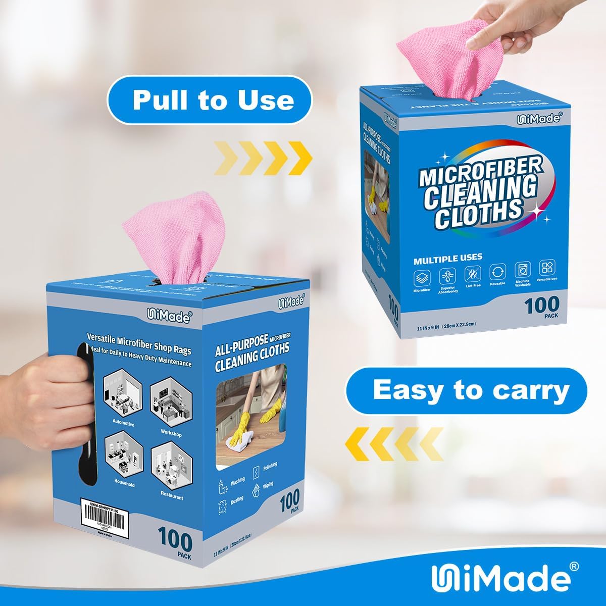 Microfiber Cleaning Cloth, 100 Sheets Microfiber Towels for Cars Commercial Grade Shop Towel Washcloths Lint-Free Bulk Cleaning Rags for Mechanic Restaurant Garage Housekeeping, 11"x 9", Pink