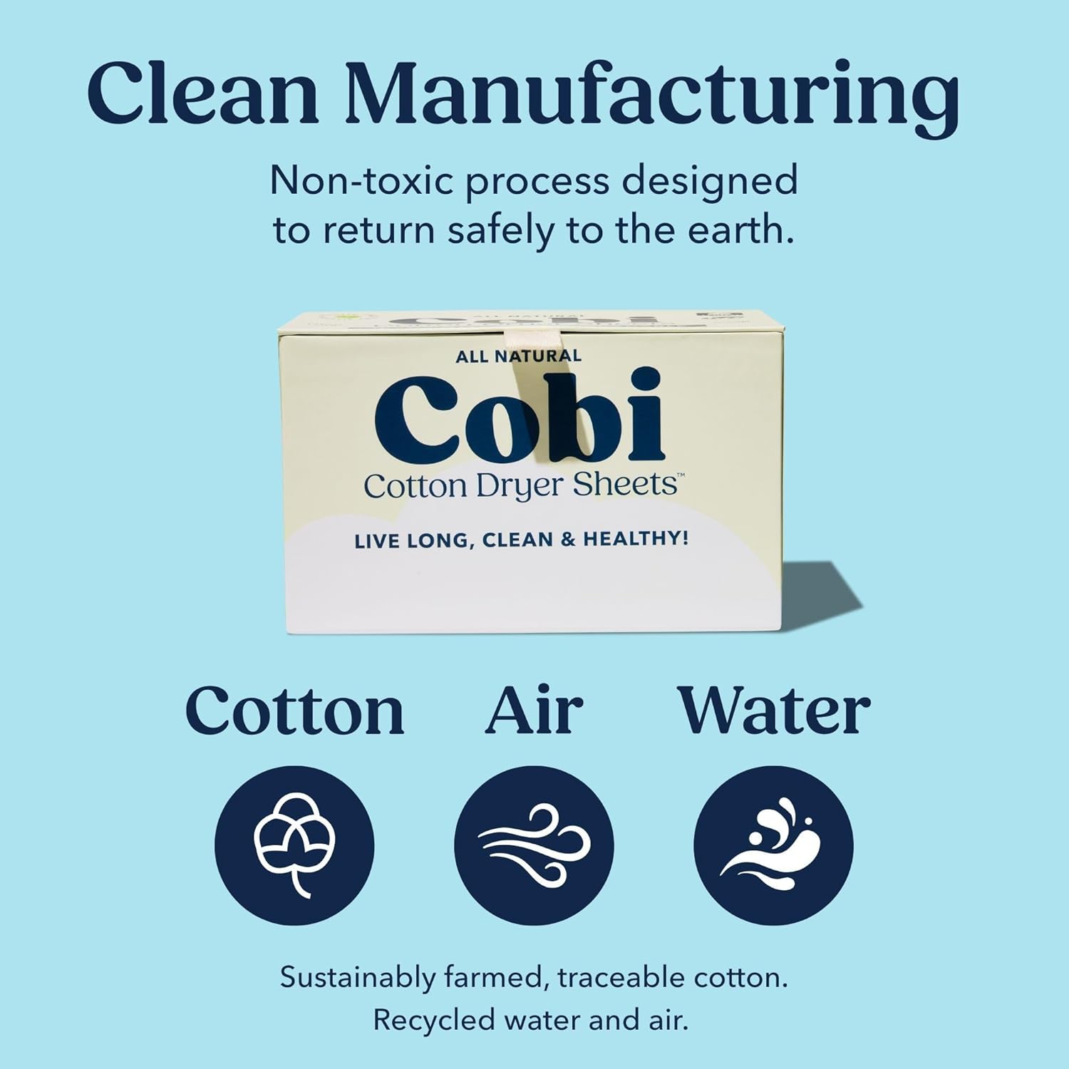Cobi Eco-Friendly Dryer Sheets - 100% Cotton Biodegradable Non-Toxic & Unscented for Sensitive Skin, Clean Plant-Based Static Control, 120 Count