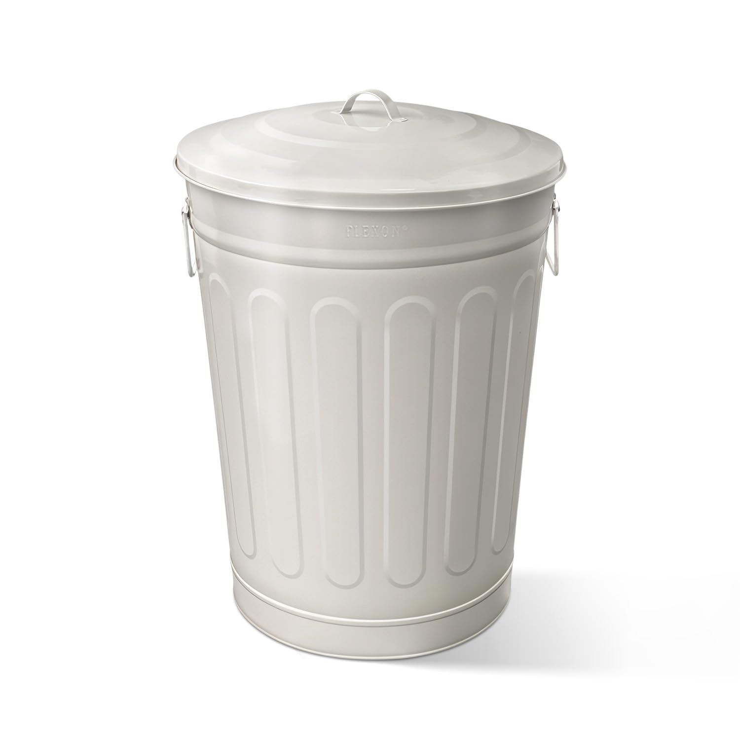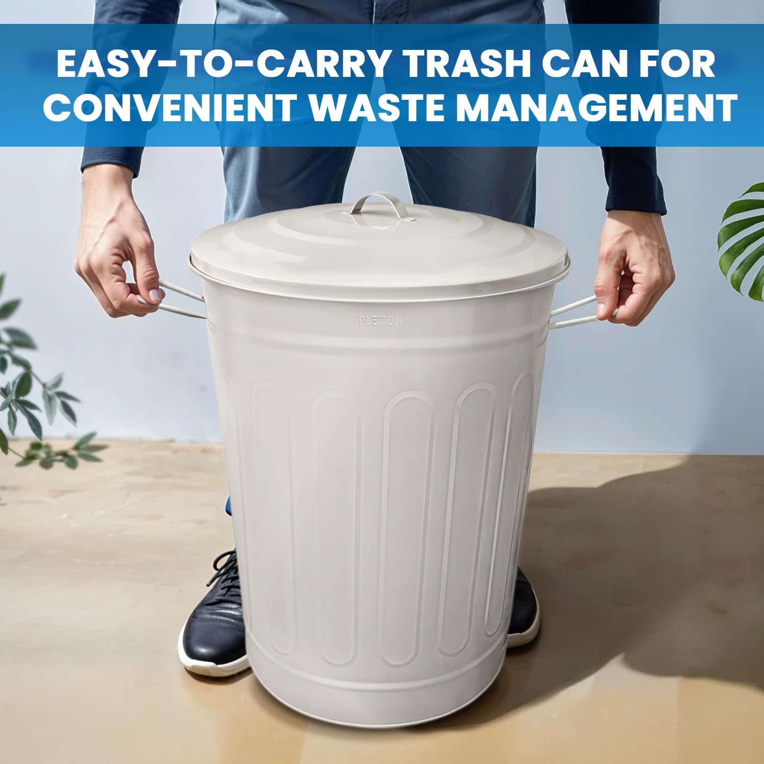 Plexon Round Trash Can 13 Gallon, Vintage Metal Outdoor Trash Can with Lid, Retro Farmhouse Garbage Container, Old School Modern Ash Bucket, Beige