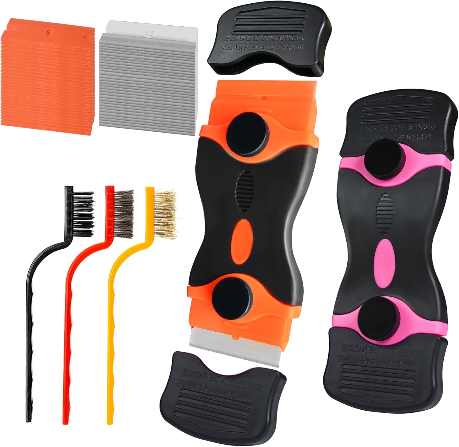 • 【Pack of 5 Razor Scraper Tools】 This pack includes two dual-head plastic scrapers, designed for versatility in various cleaning tasks. Additionally, it features three wire brushes for different applications and a total of 50 blades, ensuring you have everything you need for effective cleaning. Caution: There are sharp blades inside. Handle with care and keep out of reach of children.
