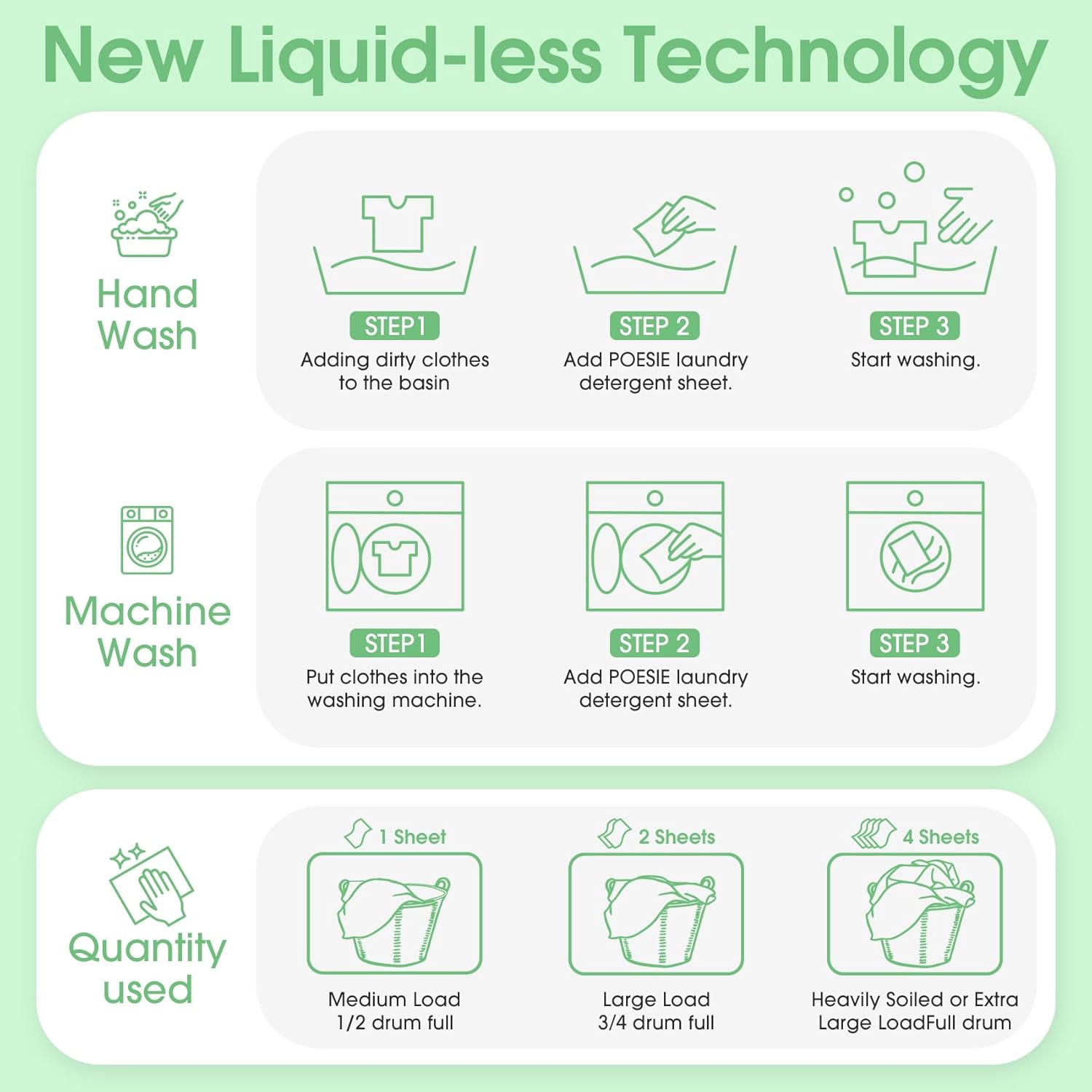 • Easy to Use - Liquidless detergent sheets, 1 sheet for small or medium loads where clothes are not very dirty, 2 sheets for large loads and 4 sheets for extra large loads, no waste. Not too little and not too much to save resources