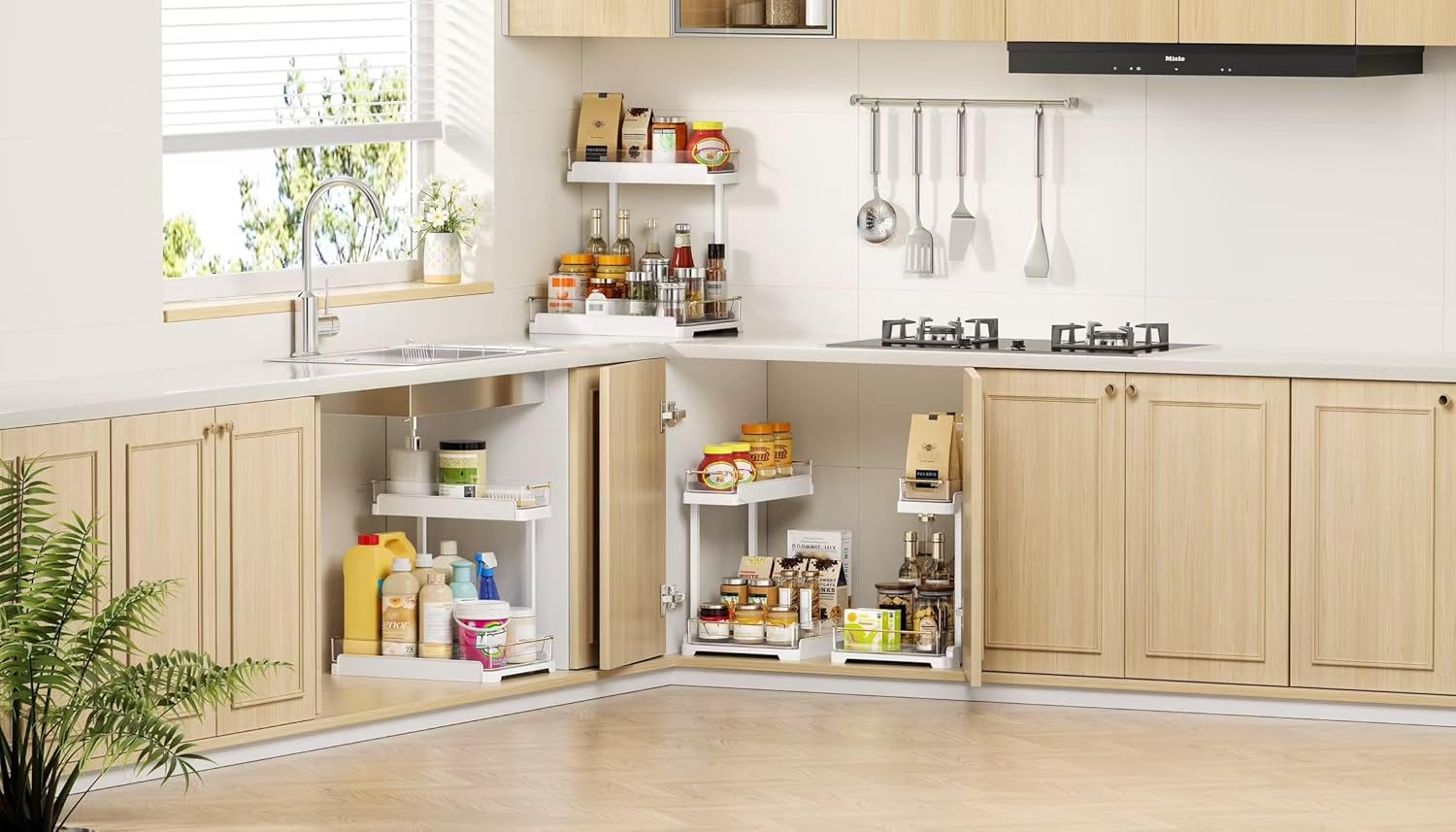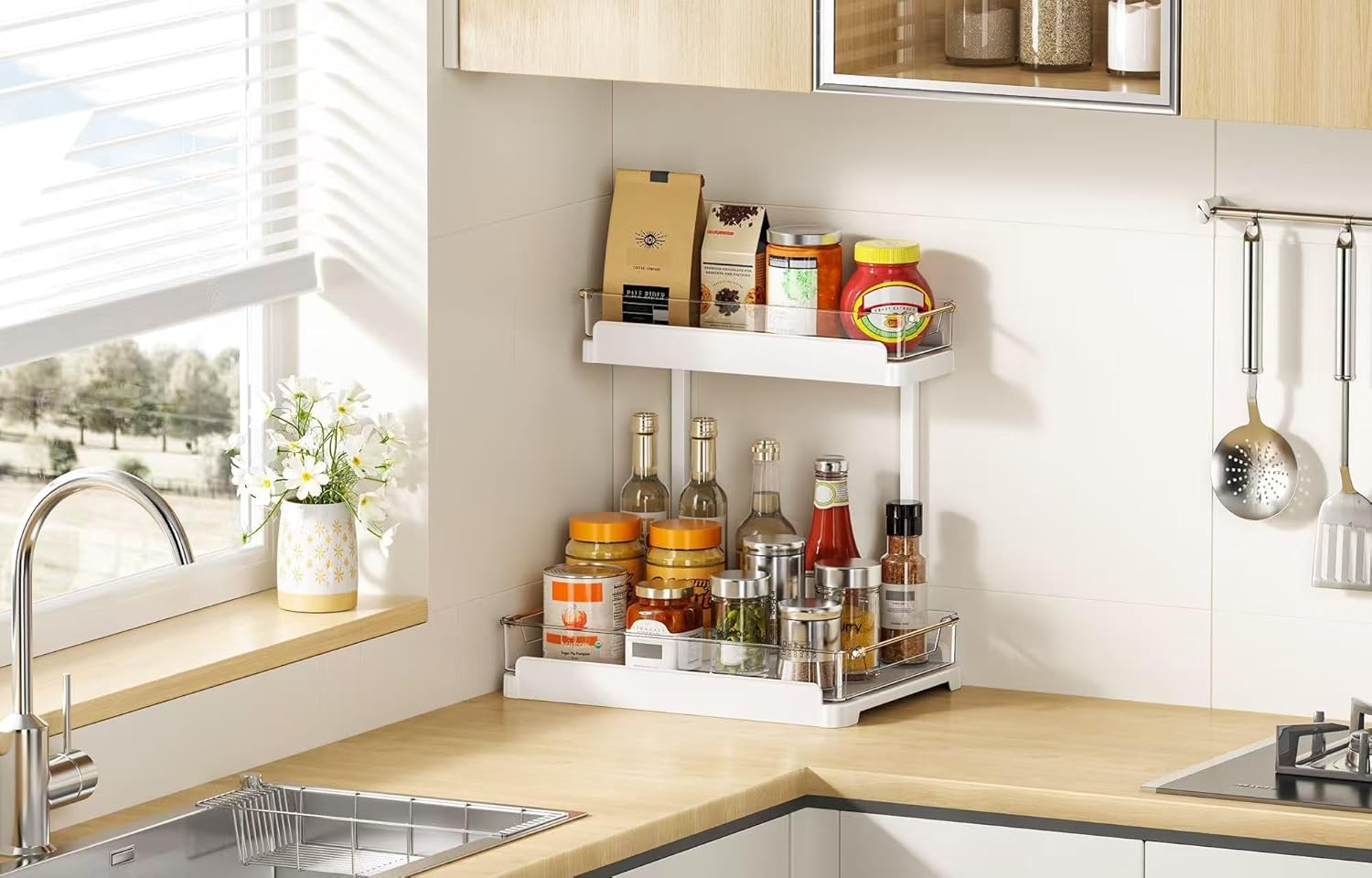 • 【2-Tier L Shape Design for Easy Access】 The 2 - tier L - shaped design allows easy access to tall items like cleaning supplies, toiletries, makeups or snacks .The trays for both upper and lower are removable and washable.