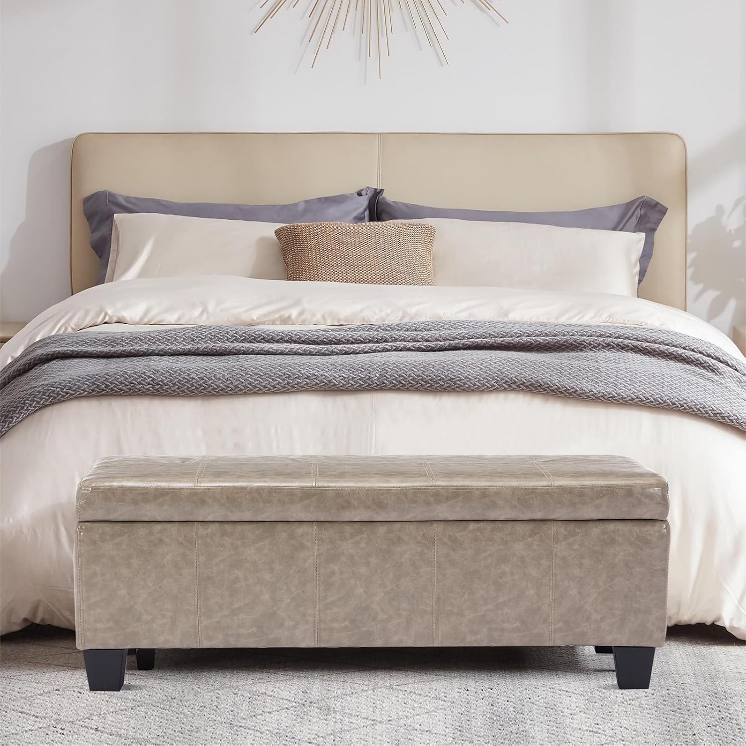 Faux Leather Ottoman with Storage, 42 Inch Rectangular Storage Ottoman Bench with Safety Hinged Lid, Large Upholstered End of Bench for Bedroom Entryway Living Room, Grey