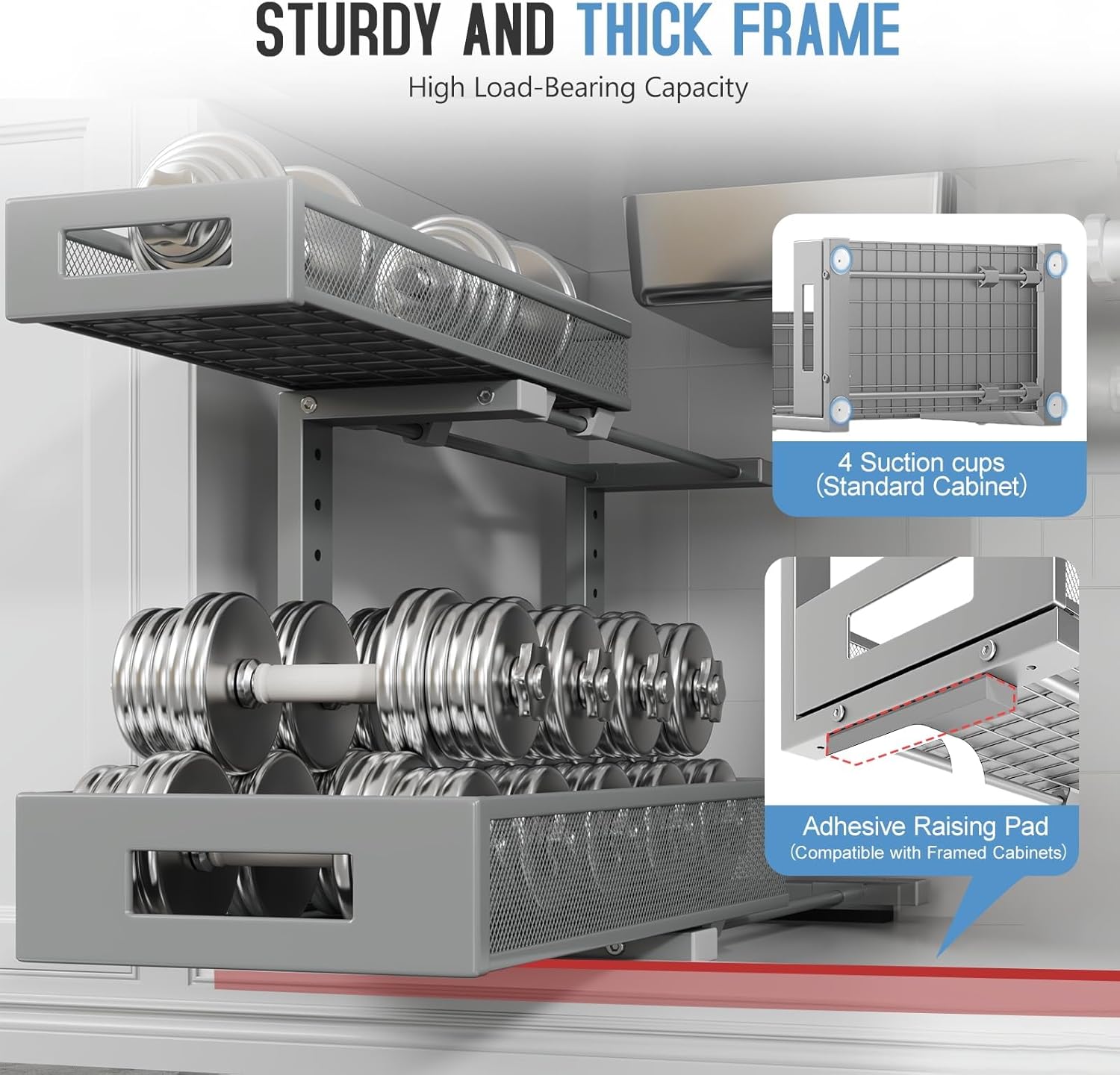 • 【2-Tier Pull-Out Design for Easy Access】This under-sink organizer features a double-layer pull-out design, allowing you to easily access items at the deepest part. The upgraded, thickened iron circular sliding rails ensure a smooth and seamless pulling experience, making each use effortless. The unique pull-out locking mechanism effectively prevents the drawers from being completely pulled out, avoiding the risk of items falling or structural damage caused by over-pulling, ensuring safer