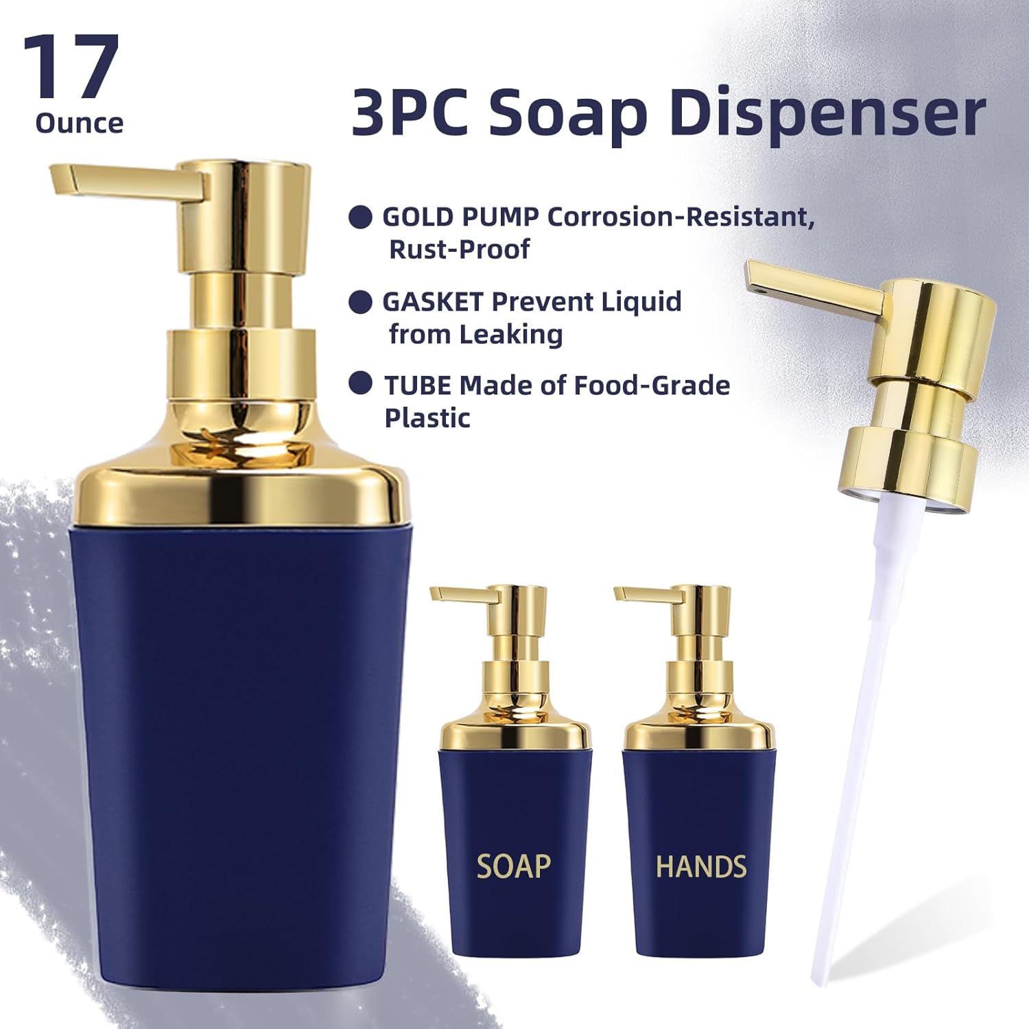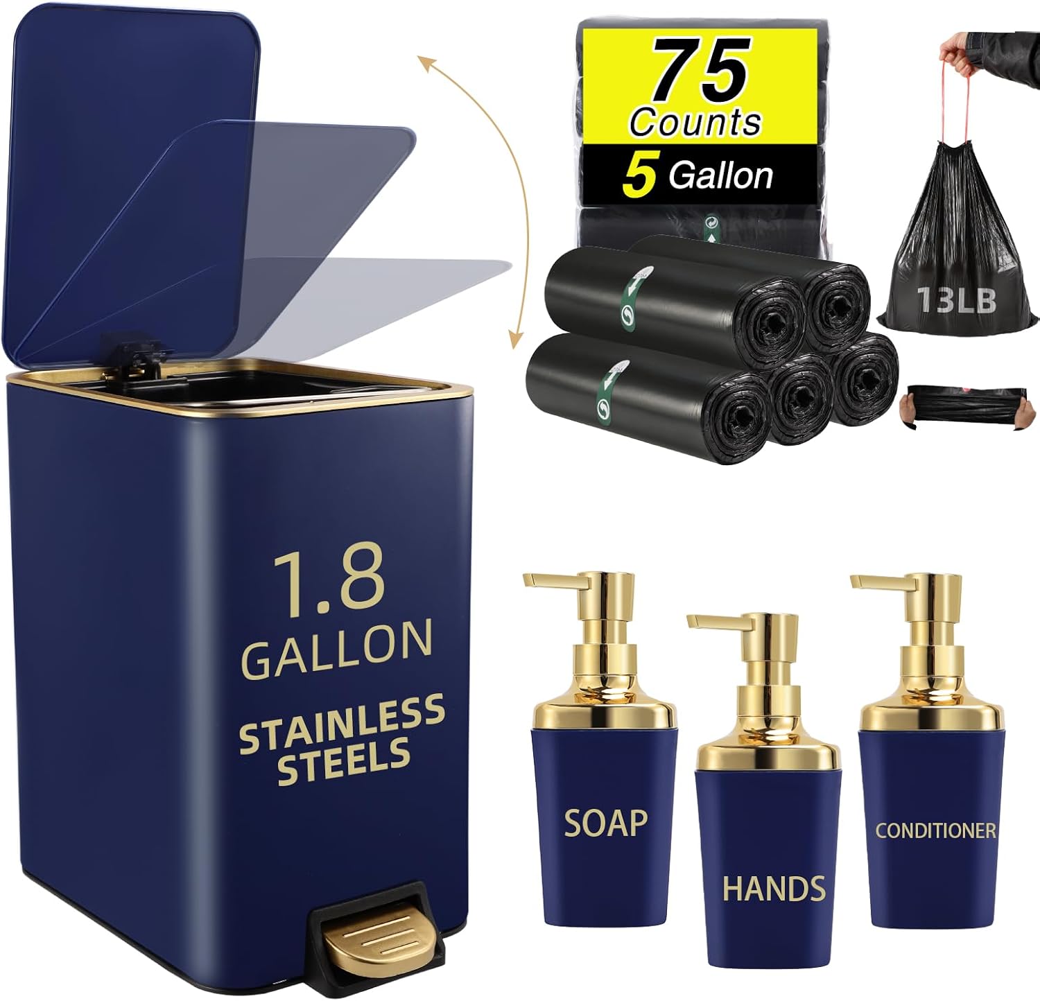 • [Package Included]:Trash can,3PCS Soap Dispenser,75 Count 5 Gallon Trash Bag,6 Waterproof Tags. each accessory is carefully selected to meet your daily needs.Our black and gold bathroom set is not only practical but also beautiful, making your bathroom space more neat and comfortable