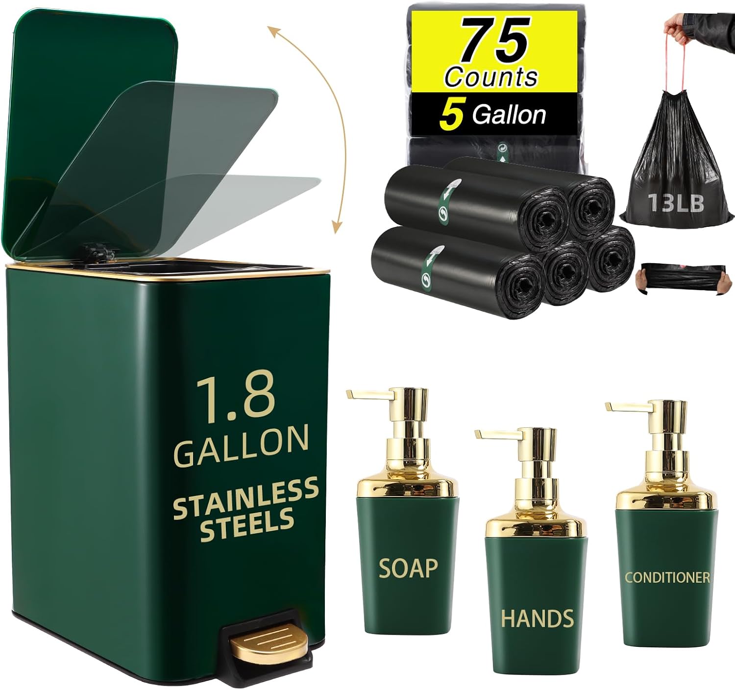 • [Package Included]:Trash can,3PCS Soap Dispenser,75 Count 5 Gallon Trash Bag,6 Waterproof Tags. each accessory is carefully selected to meet your daily needs.Our black and gold bathroom set is not only practical but also beautiful, making your bathroom space more neat and comfortable