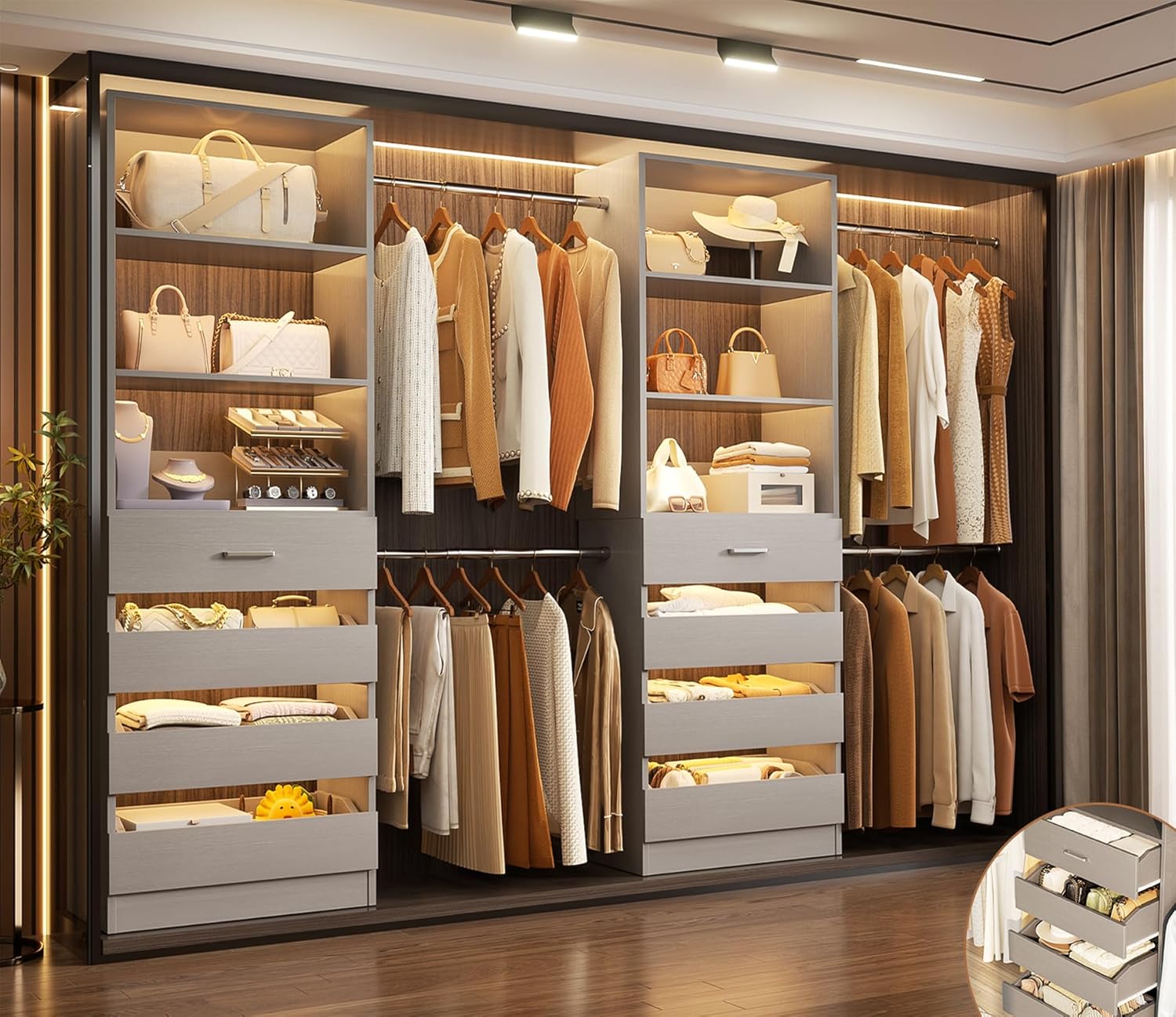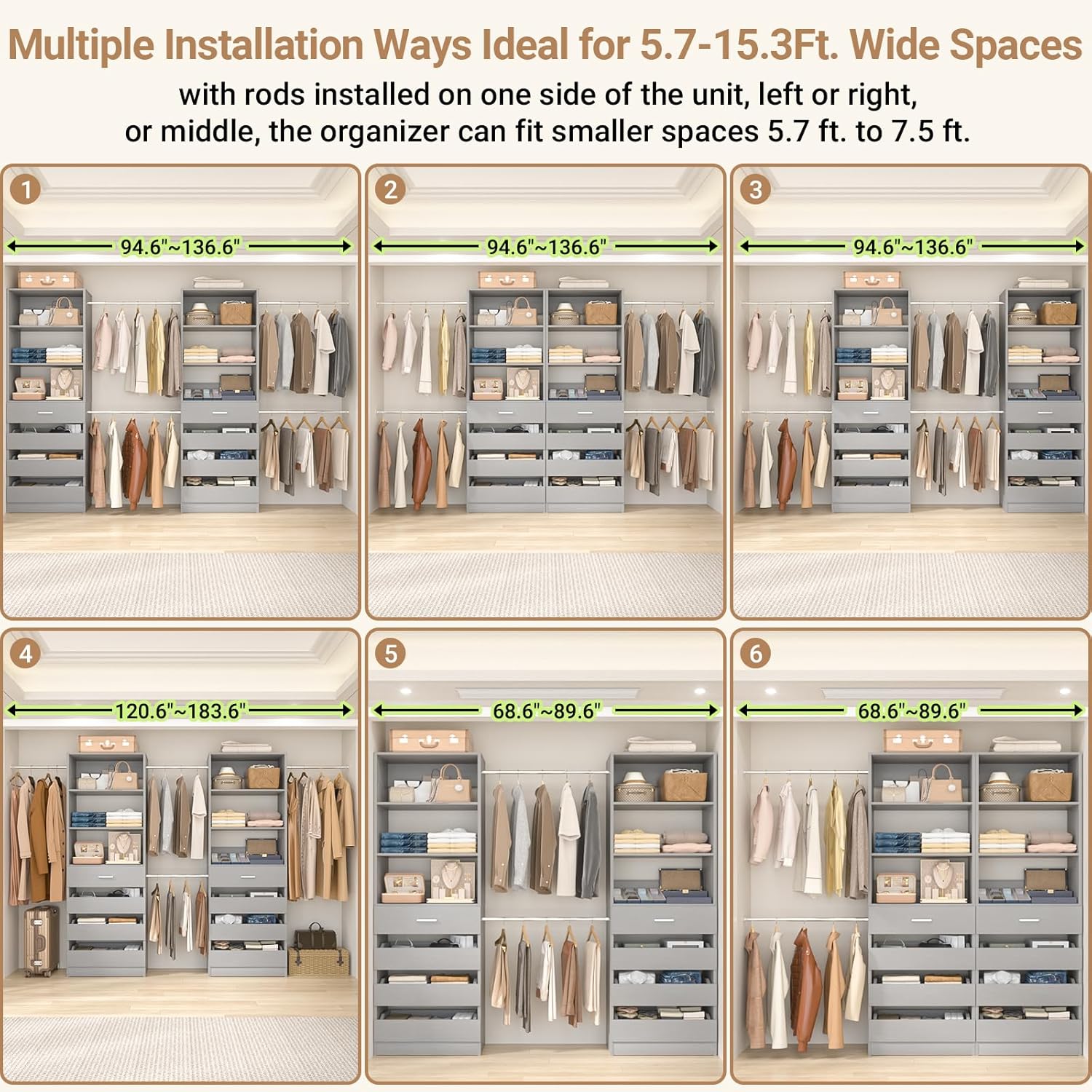 Aheaplus Closet System, 6-15Ft Closet Organizer with 8 Wooden Drawers, Wood Closet Organizer System with Tower, Walk-in Closet Organizer Wardrobe Garment Clothes Rack with 4 Hanging Rods, Grey