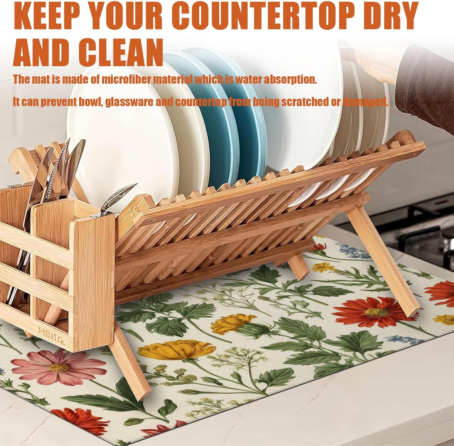 Spring Wild Flower Dish Drying Mat for Kitchen Counter Microfiber Absorbent Dish Kitchen Drying Mat Draining Reusable Washable for Dishes/Utensils/Counterto