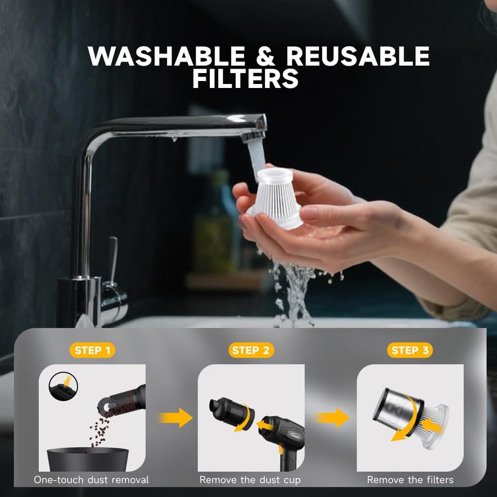 • Washable & Reusable HEPA Filters :The cordless portable car mini vacuum is equipped with high-quality HEPA filters that ensures thorough cleaning by effectively trapping dust and particles. And the one-click dust emptying design allows for simple and hygienic disposal of debris, keeping your hands clean