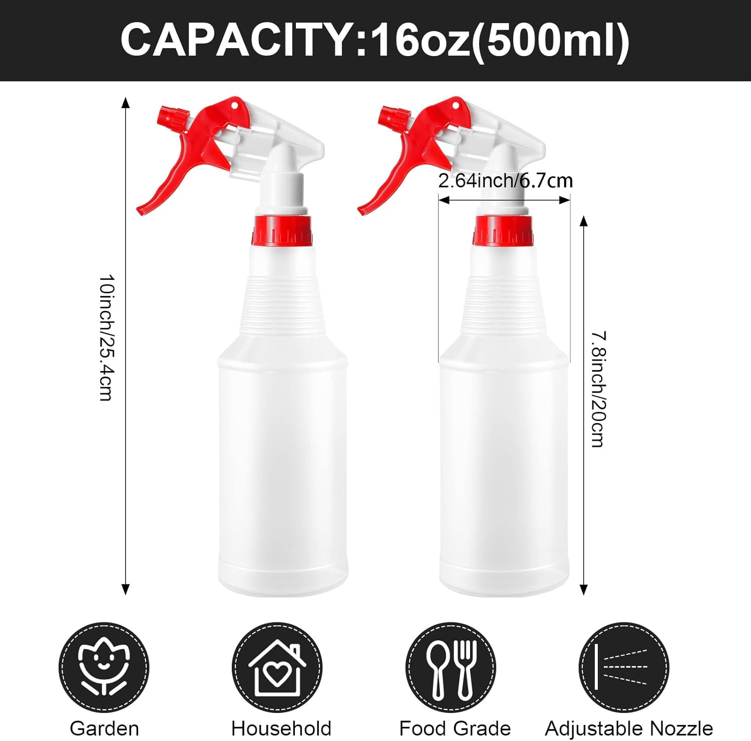 • Size and Capacity: the diameter of the empty spray bottles is approx. / 2.64 inches, the length is approx. 10.24 inches, and the capacity is 16 oz, suitable size to meet your various needs