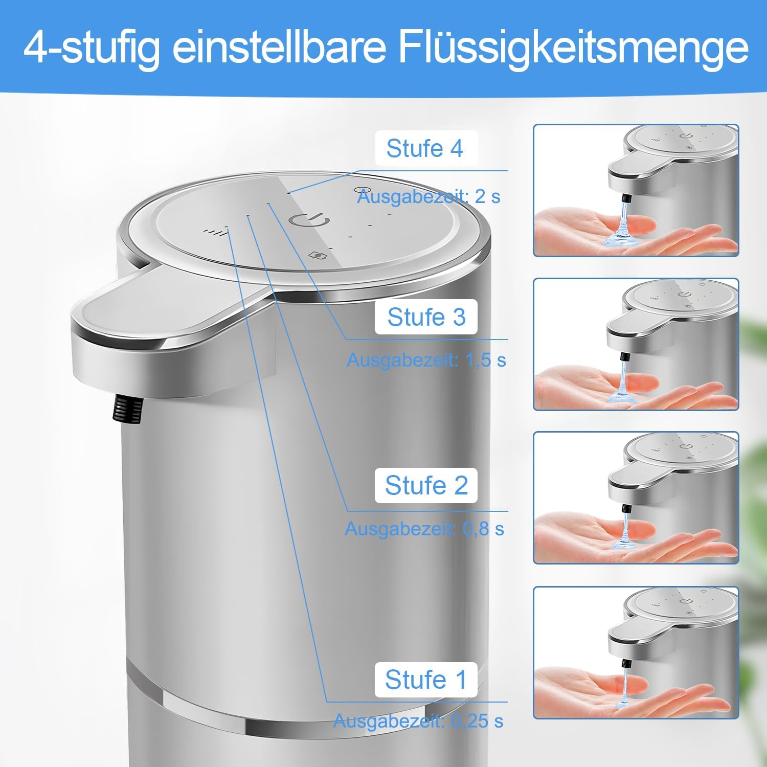 • 🌻 【4-Level Liquid Volume Adjustable】-- There are 4 different Liquid soap dispenser settings for options, only by touch the power button once to adjust the liquid volume ( And keep pressing the power button for 3seconds to turn on/off the dispenser ). The liquid volume weight is 0.5g / 1.5g / 2.4g / 3.2g (Base on each level of liquid soap volume setting) .