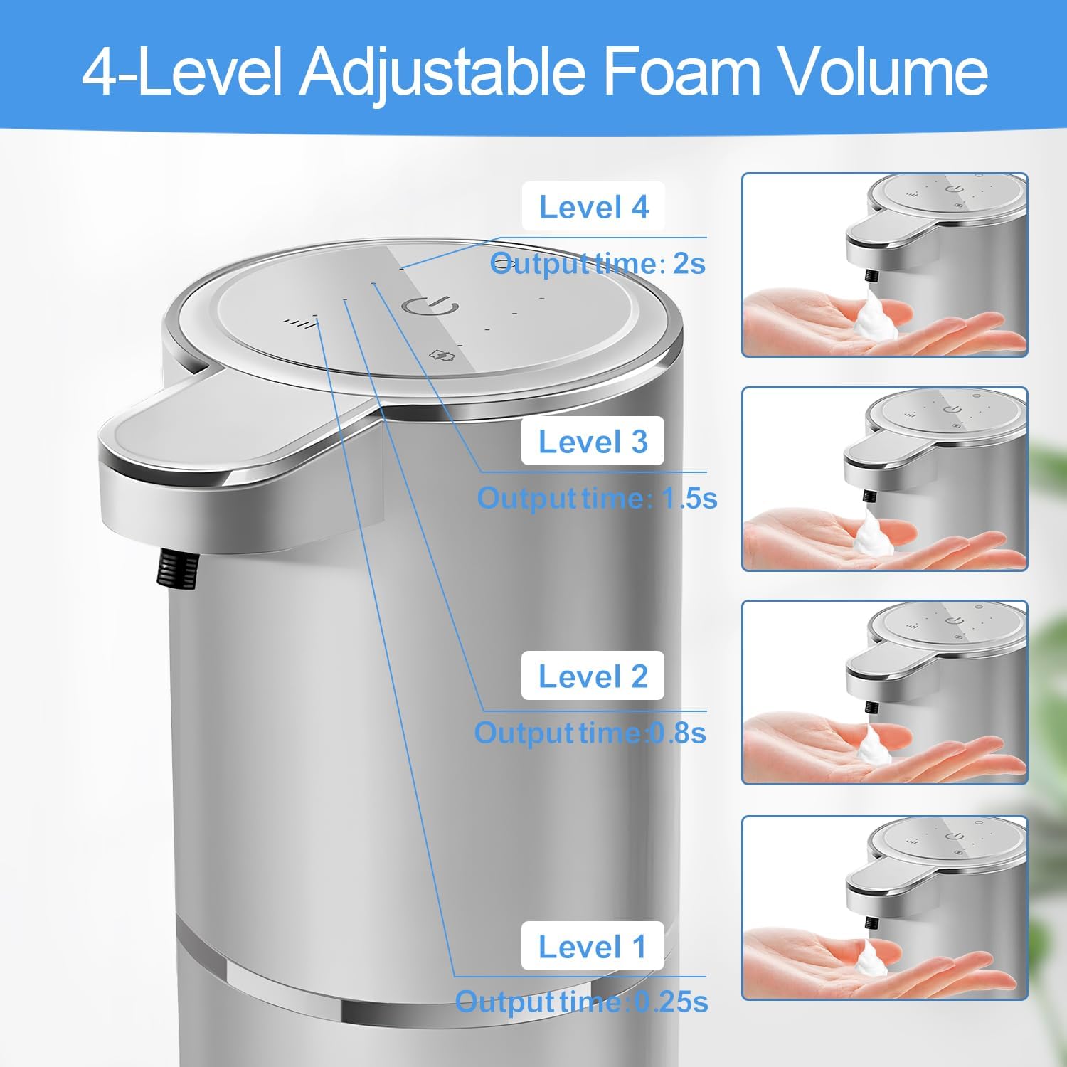 • 🌻【4-Level Foaming Soap Volume Adjustable】-- There are 4 different Foaming soap dispenser settings for options, only by touch the power button once to adjust the soap volume ( And keep pressing the power button for 3seconds to turn on/off the dispenser ). The soap volume weight is 0.5g / 1.5g / 2.4g / 3.2g (Base on each level of soap volume setting) .