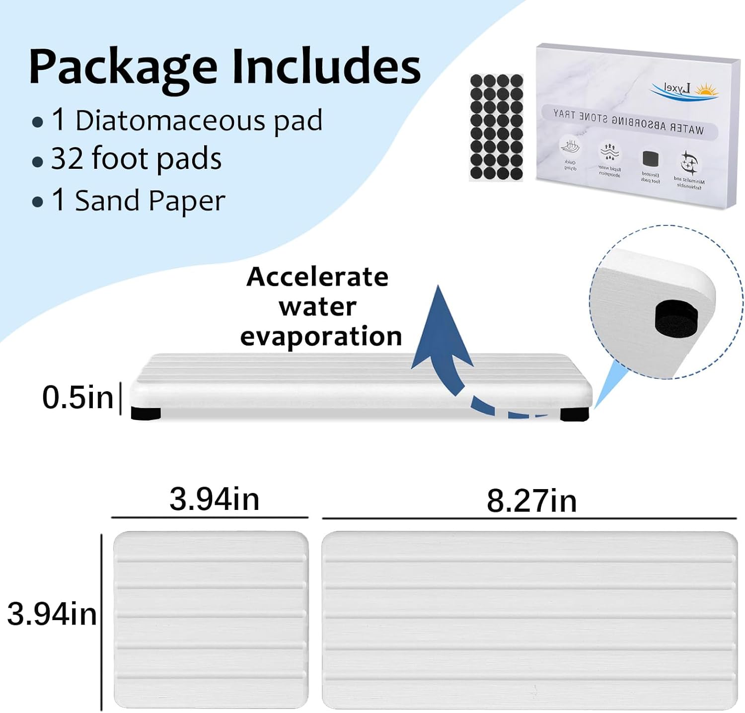 • More Anti Slip and Ventilated --- The silicone footpads boost the slip-resistance of stone drying tray while keeping them out of the bathroom vanity.This design improves the contact surface between fast drying stone sink tray and air, accelerates the evaporation of water,and extends the service life of the water absorbing stone tray for sink.