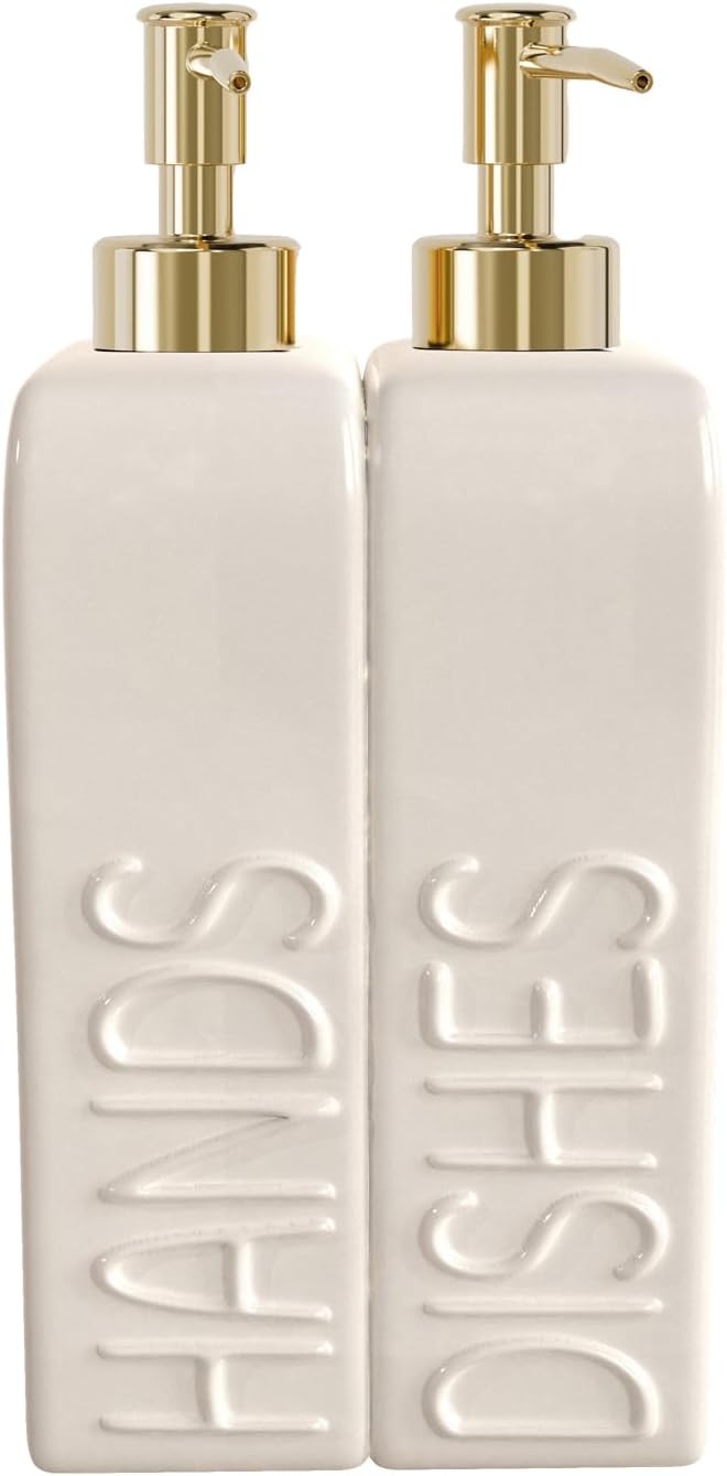 • Stylish Soap Dispenser Set: Includes two ceramic pump bottles embossed with “HANDS” and “DISHES”, perfect for organizing soap and adding a decorative touch to your kitchen or bathroom sink area