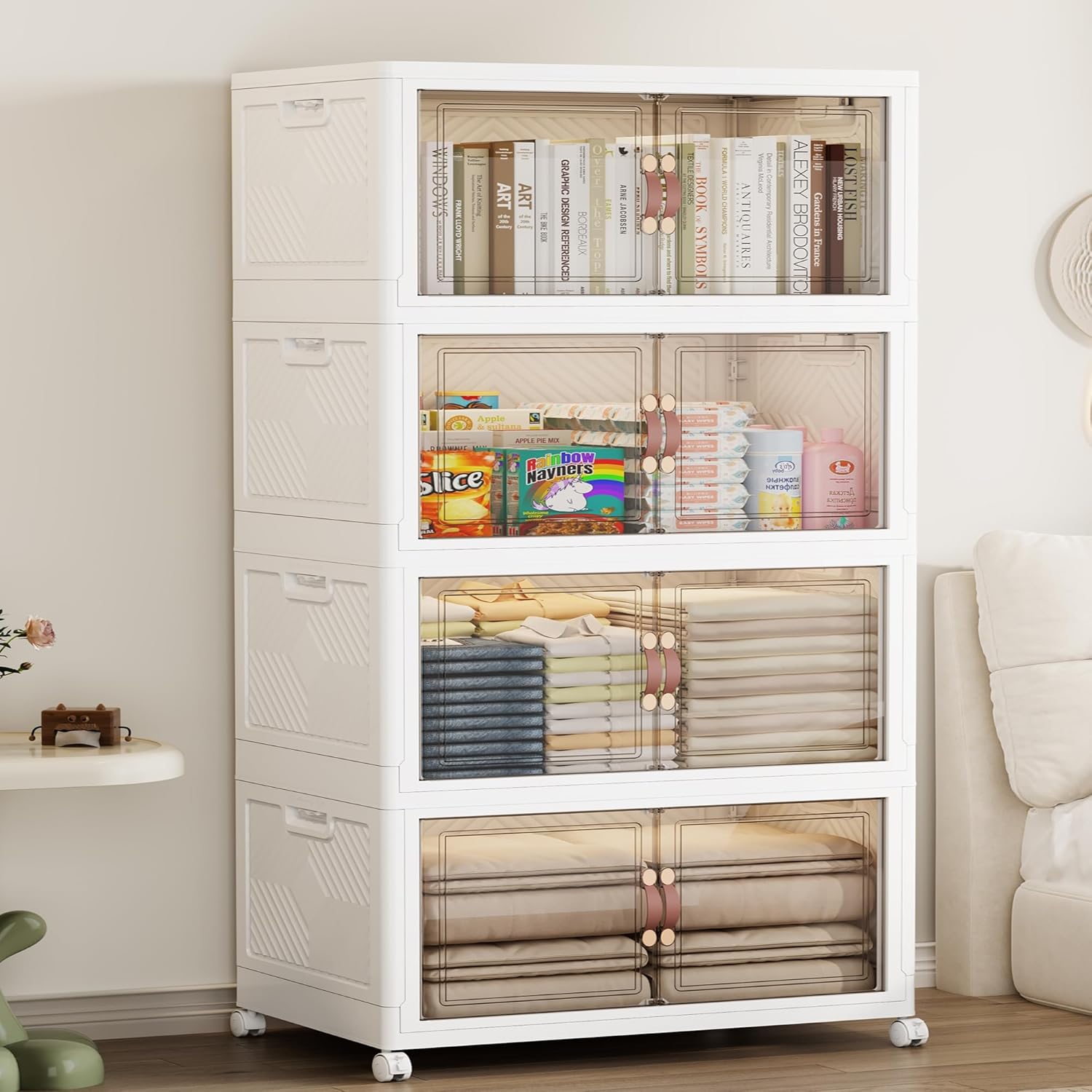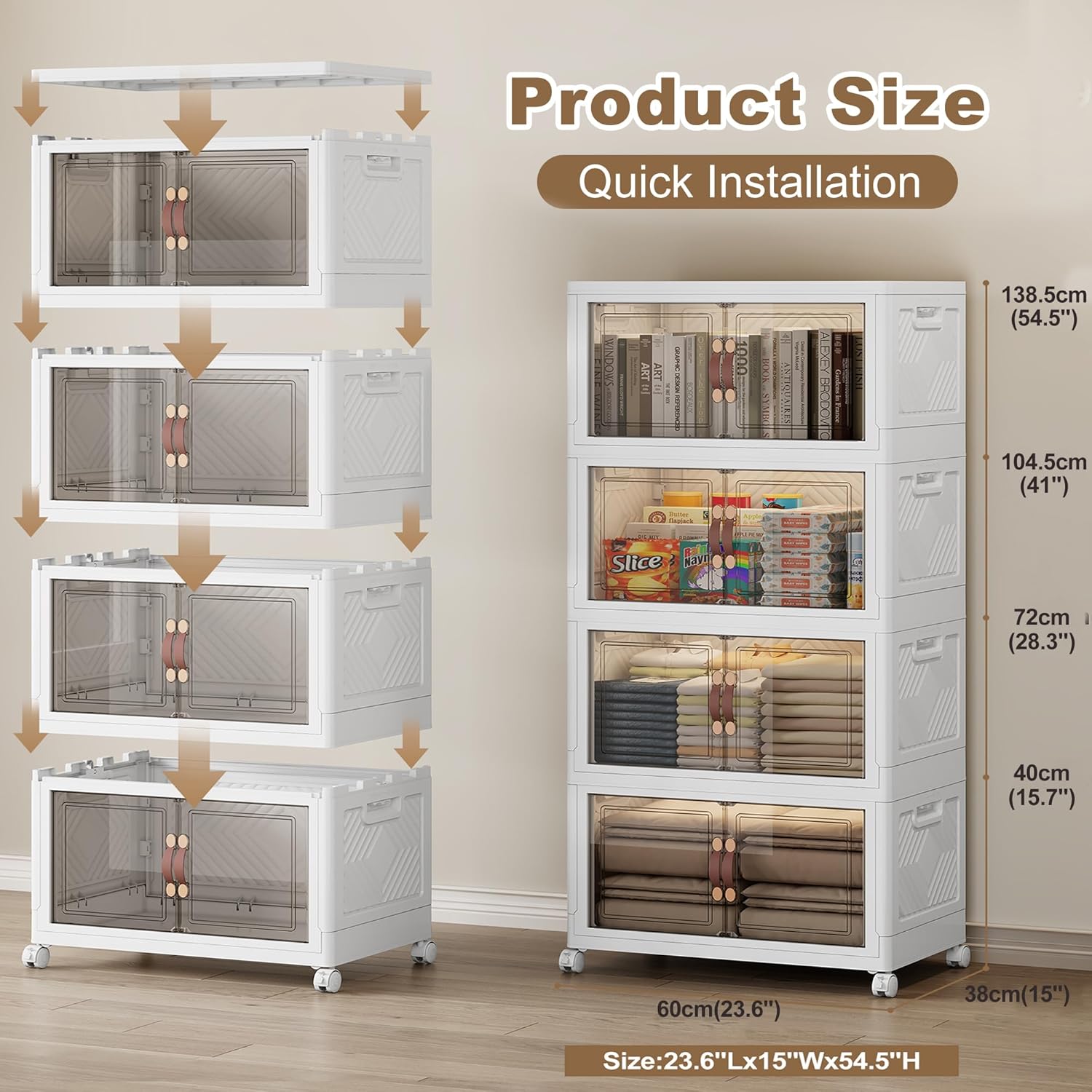 SAILUN 308QT Extra Large Collapsible Storage Bins with Wheels and Lid, Stackable Storage Bins Open Closet Organizers and Storage Storage Containers Drawers,23.6" L × 15" W × 54.5" H(4 Pack)
