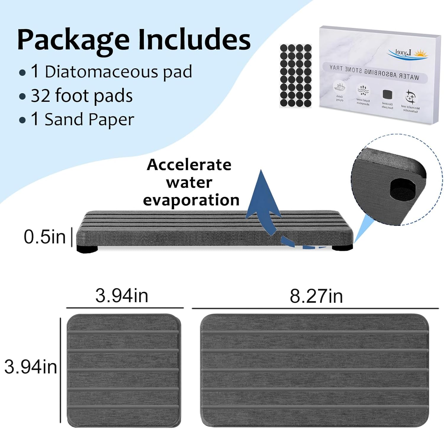 • More Anti Slip and Ventilated --- The silicone footpads boost the slip-resistance of stone drying tray while keeping them out of the bathroom vanity.This design improves the contact surface between fast drying stone sink tray and air, accelerates the evaporation of water,and extends the service life of the water absorbing stone tray for sink.