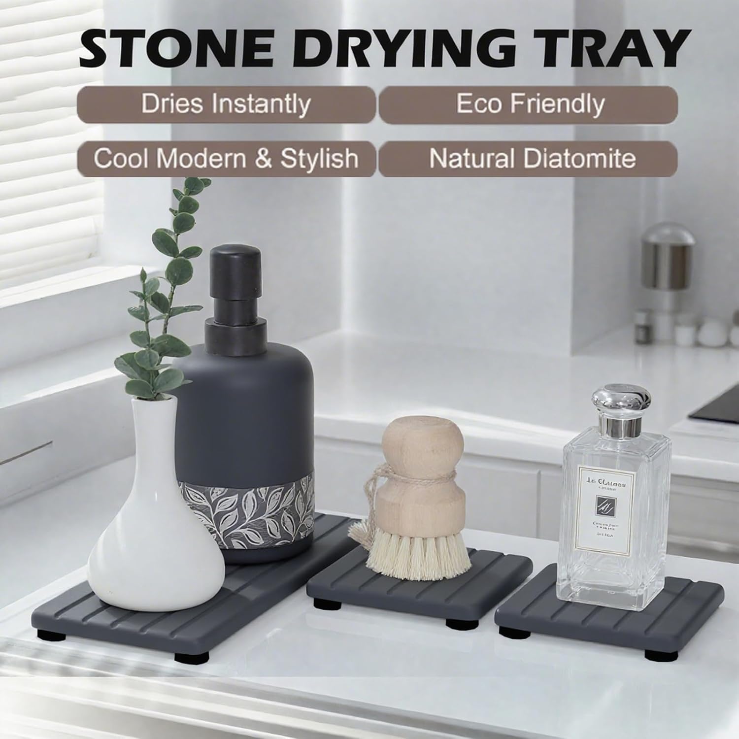 3PCS Stone Drying Tray, Stone Soap Tray, Water Absorbing Stones Trays for Sink, Fast Dry Diatomite Stones Sink Mat, Used for Hand Soap,Sponge,Toothbrush Holder in Bathroom Counter and Kitchen Sinks