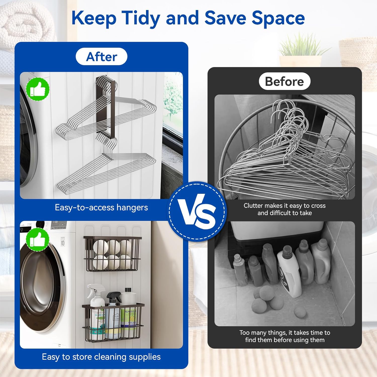 • Maximize Laundry Room Organization and Storage Space: The magnetic dryer ball holder and hanger organizer can be placed on the side or front of the dryer for easy to access and saving space on the laundry countertop. The small space in a small laundry room can also be reasonably utilized, and there will be no more messy placement and scattering.