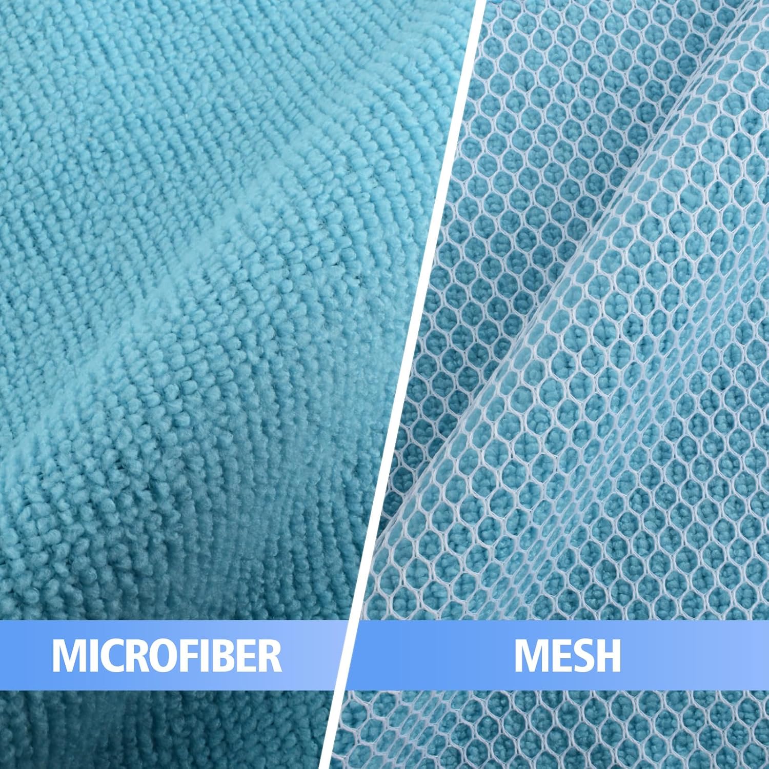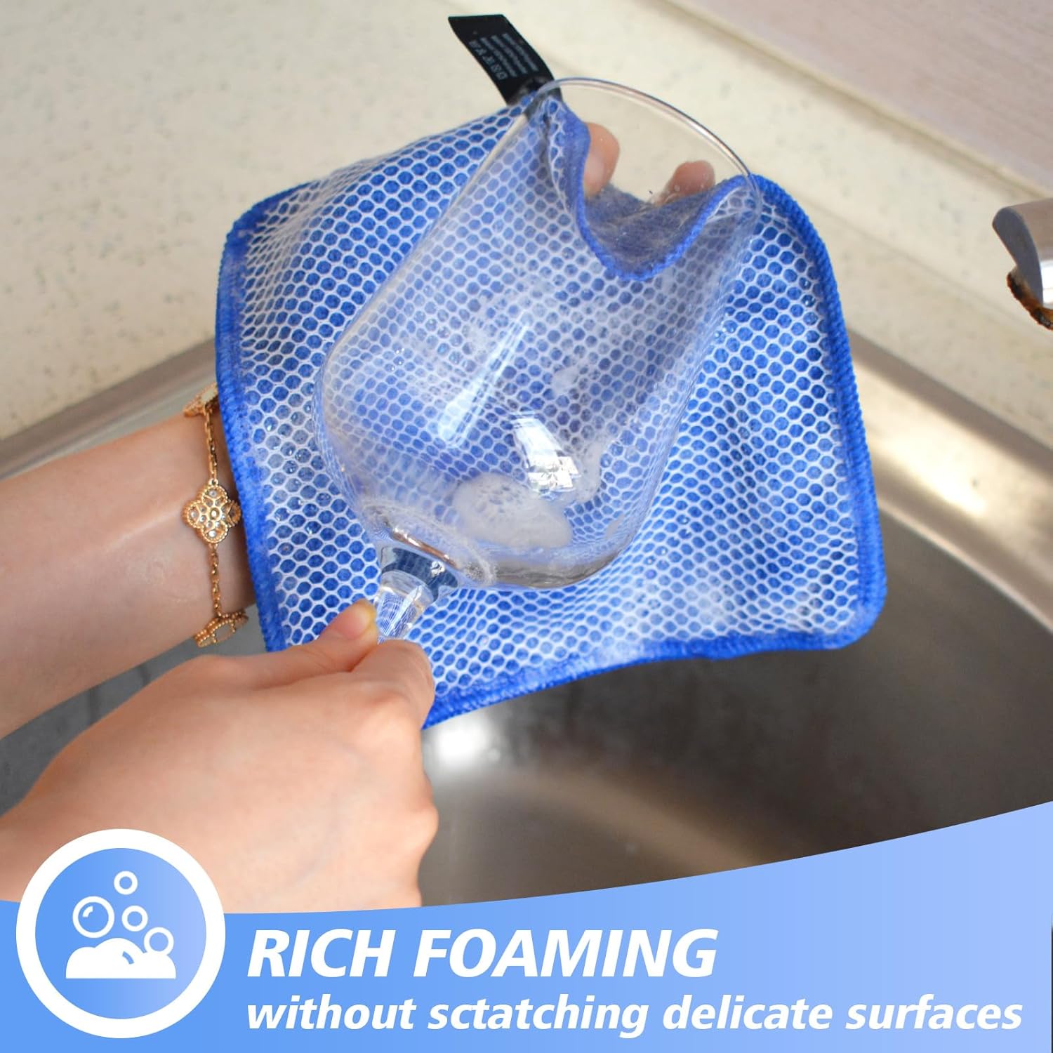 • DISH RAGS FOR KITCHEN CLEANING WITH POLY SCOUR SCRUBBING SIDE: One side is microfiber and the other side is mesh. The microfiber side works well at getting finger spots off the stainless steel appliances and the glass front of fridge or stove, microwave; the scrubby side is good for cleaning stuck on food without having to grab your scraper and does not scratch delicate surfaces either