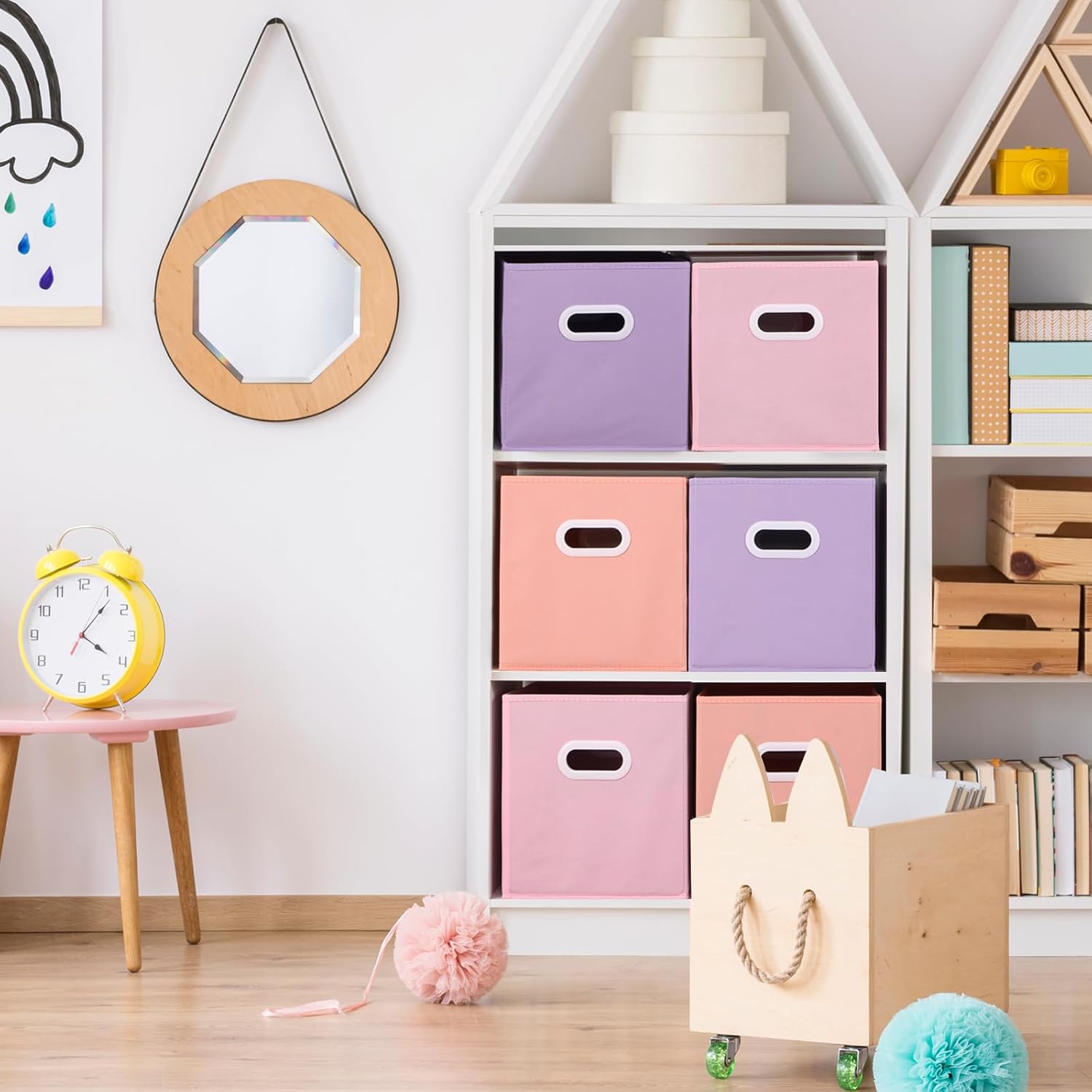 • Wide Range of Uses: Colorful storage boxes are widely used in playrooms, children's rooms, storage rooms, laundry areas, etc., and can also be placed on shelves, kitchen walls, floors, desks, etc.; Various things can be put in easily, whether they are paintings, toys, books, clothes, shoes, sheets, or quilts, making your room look neat and clean.They not only provide the storage space but also enriching the home decoration.
