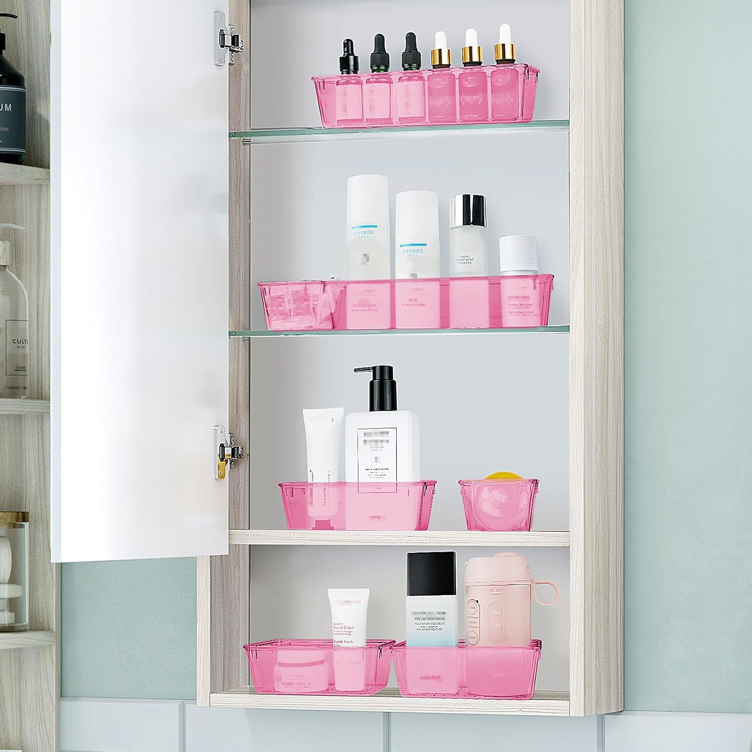 • 4 Combinations of Different Sizes: A set of cabinet organizer includes 25 storage bins of 4 different sizes. Includes: 9 x 6 x 1.8 inches (3pcs), 9 x 3x 1.8 inches(6pcs), 6 x 3 x 1.8 inches(8pcs), 3 x 3 x 1.8 inches(8pcs)