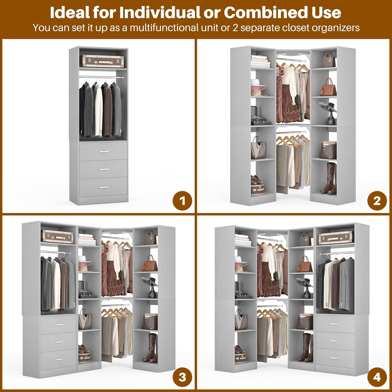 • 2-in-1 Closet System Holds 400+ Clothes: Are you looking for a corner closet with extra large storage space? Besiost closet system with 2 sets will surely fit your needs. The closet system set consists of a corner closet system with 12 shelves + a closet system with 3 drawers. Total 2 large wooden drawers, 3 hanging rods, and 15+ storage shelves for t-shirts, pants, jackets, hats, bags, suitcases, etc. Hold up to 400+ clothes and small items. Visualized storage keeps everything neatly in place and within easy reach.