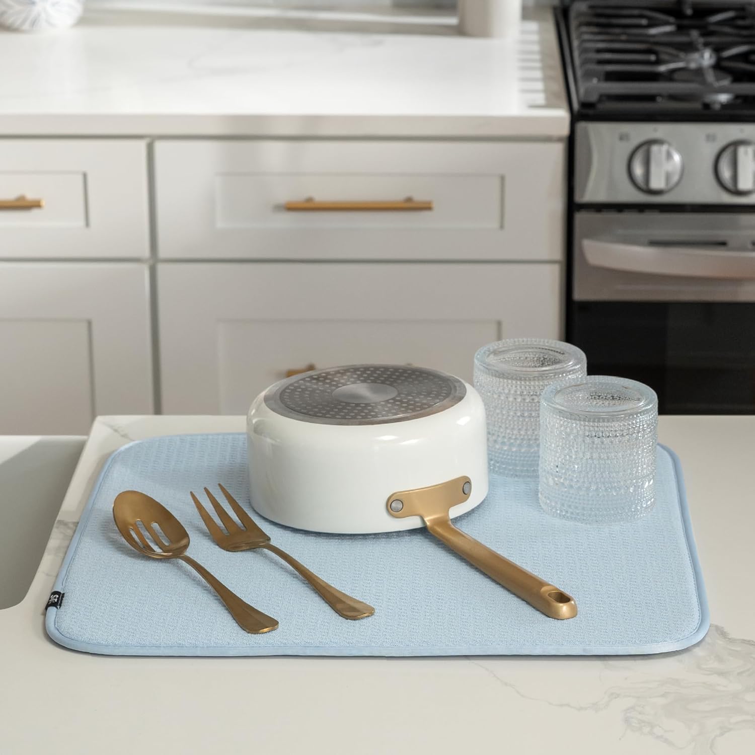 • Dish drying mats for kitchen counter are reusable, machine washable, and easy to store for kitchen organization; durable construction will not chip or break like a stone dish drying mat for kitchen