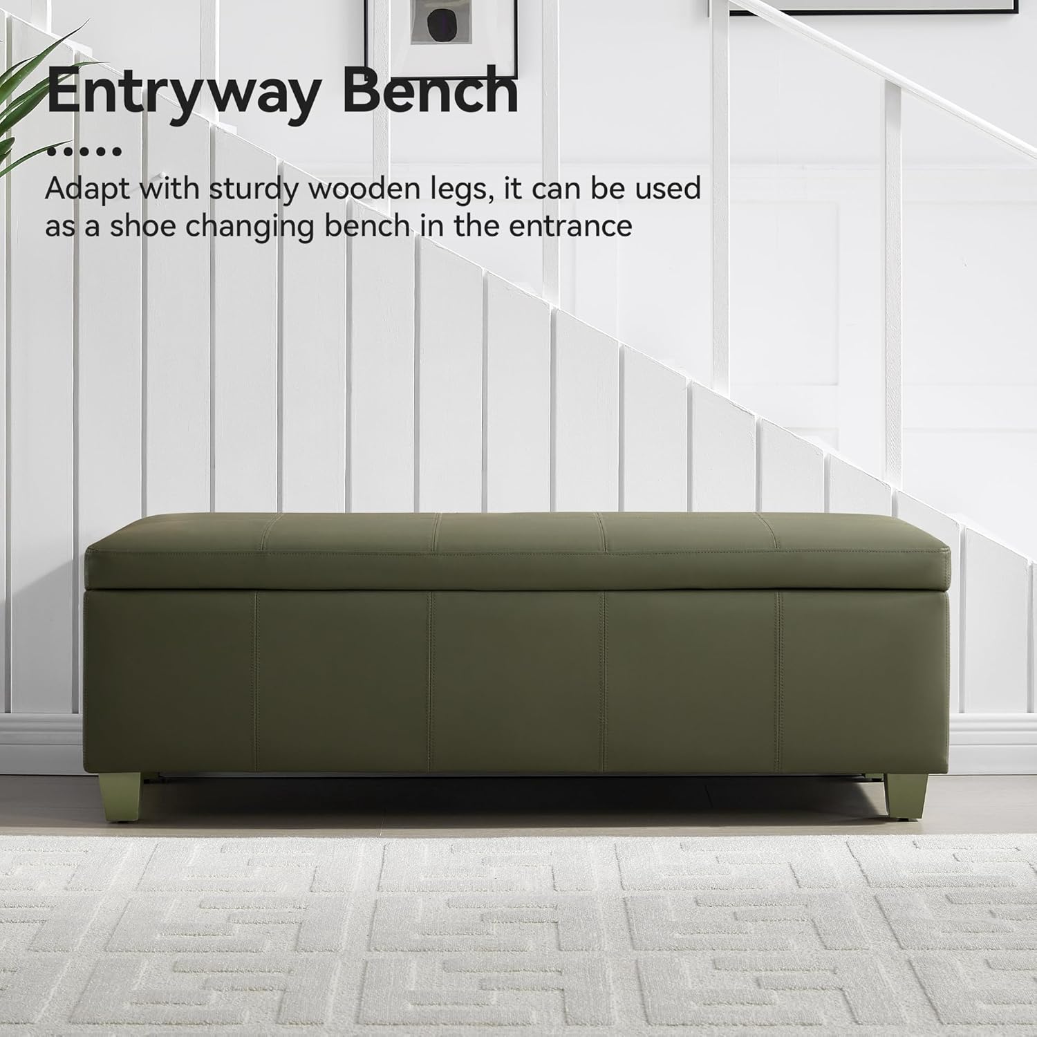 51" Faux Leather Storage Ottoman, Stitch Tufted Rectangle Upholstered End of Bed Storage Bench, Entryway Large Couch Ottoman with Wooden Legs,Green