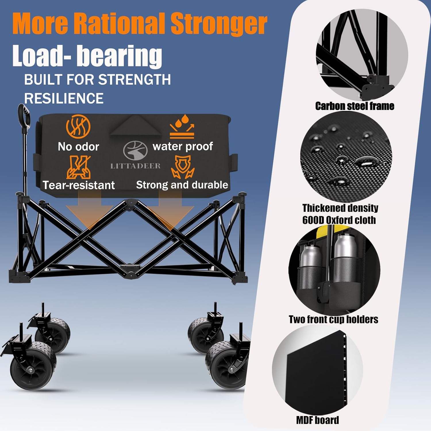 • Spacious/Versatile Storage:Littadeer folding wagon, The unfolded size is 36.6"L x 20.9"W x23.6"H, with a large storage space of 160L, providing ample space for all your equipment Adopting a unique folding design, the folding size is 13"L x 8"W x 28"H , making it easy to transport and store. Whether you are transporting groceries, sports equipment, or camping supplies, this wonderful folding cart is your preferred solution